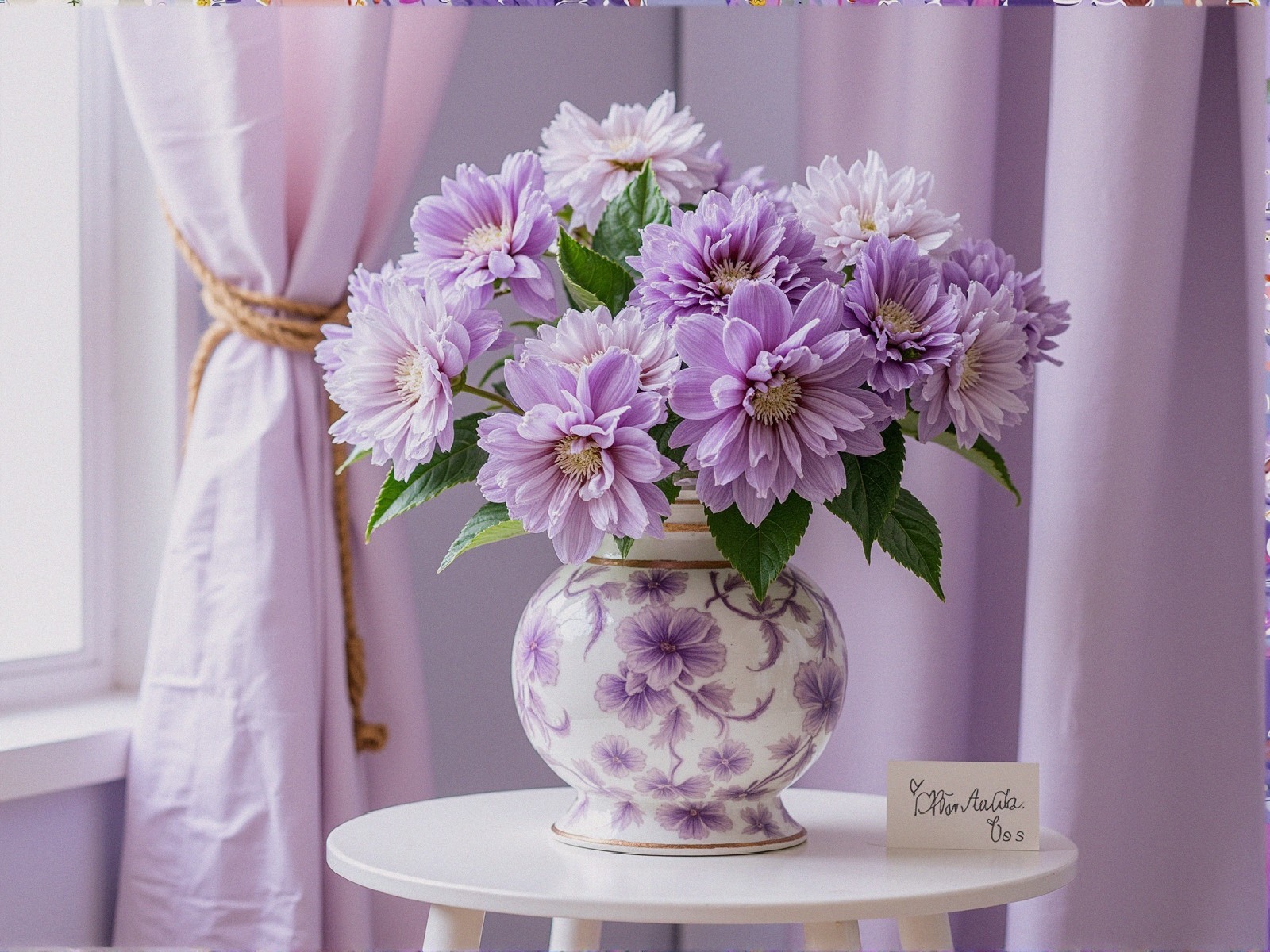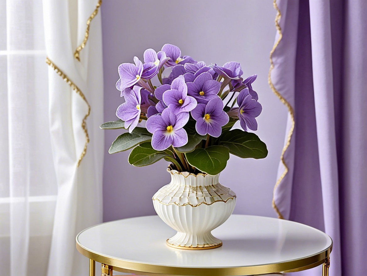 A beautiful arrangement of purple violets sits in an elegant white vase on a round table, accompanied by a greeting card. The soft purple backdrop adds a touch of warmth and elegance.