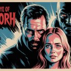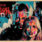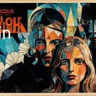 The artwork features three abstract faces in vivid colors, surrounded by geometric shapes and flowers. The style is reminiscent of early 20th-century modernism, conveying a sense of emotion and depth.