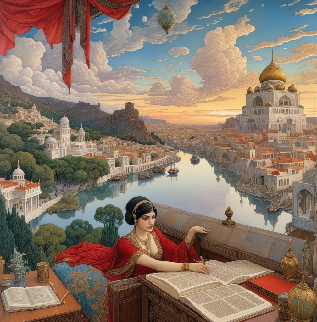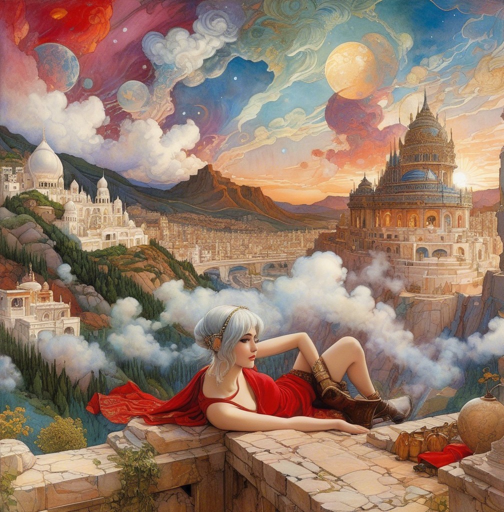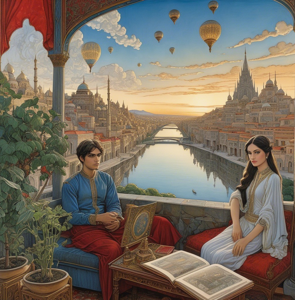 A serene scene depicts a person gazing out from a richly decorated room at a stunning cityscape and river, framed by ornate windows. Planets hang in the colorful sunset sky, creating a dreamlike atmosphere.