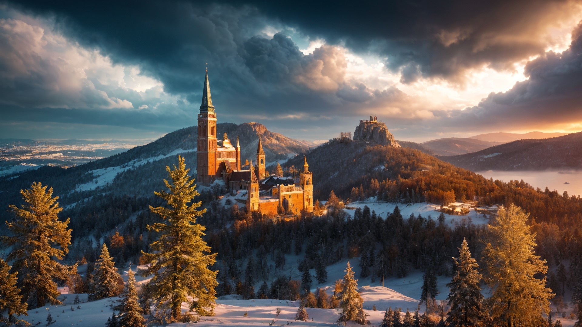 A majestic castle perched on a hill, surrounded by dense forests, towers against a dramatic sky. Warm sunset light contrasts with dark clouds, creating an enchanting, mystical atmosphere.