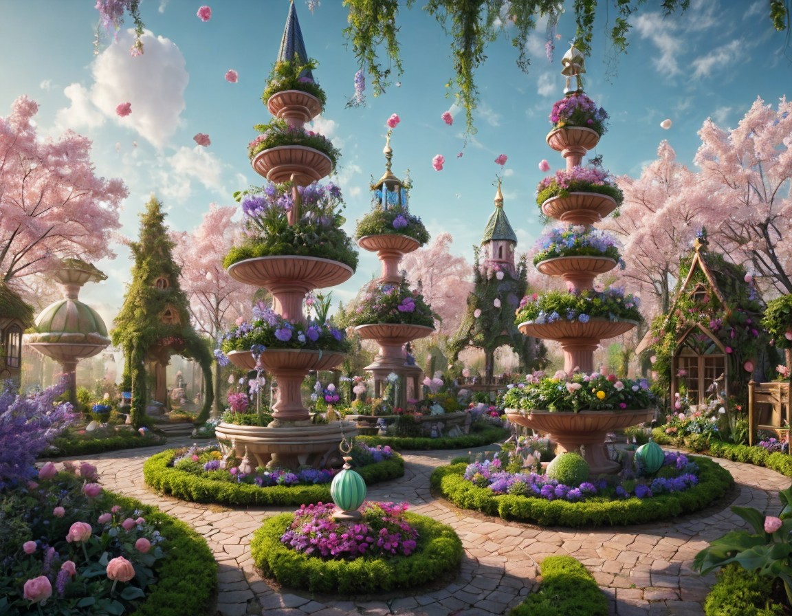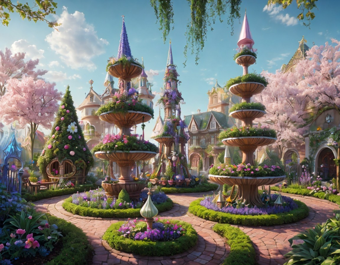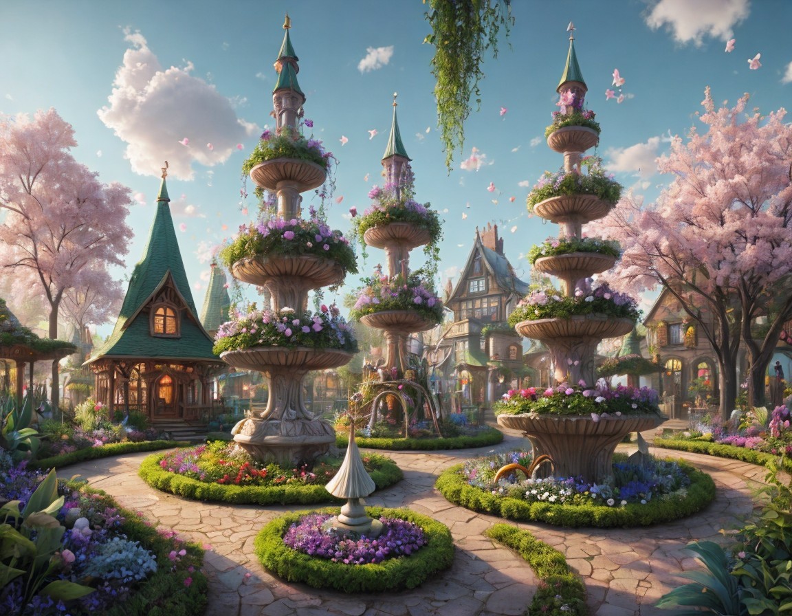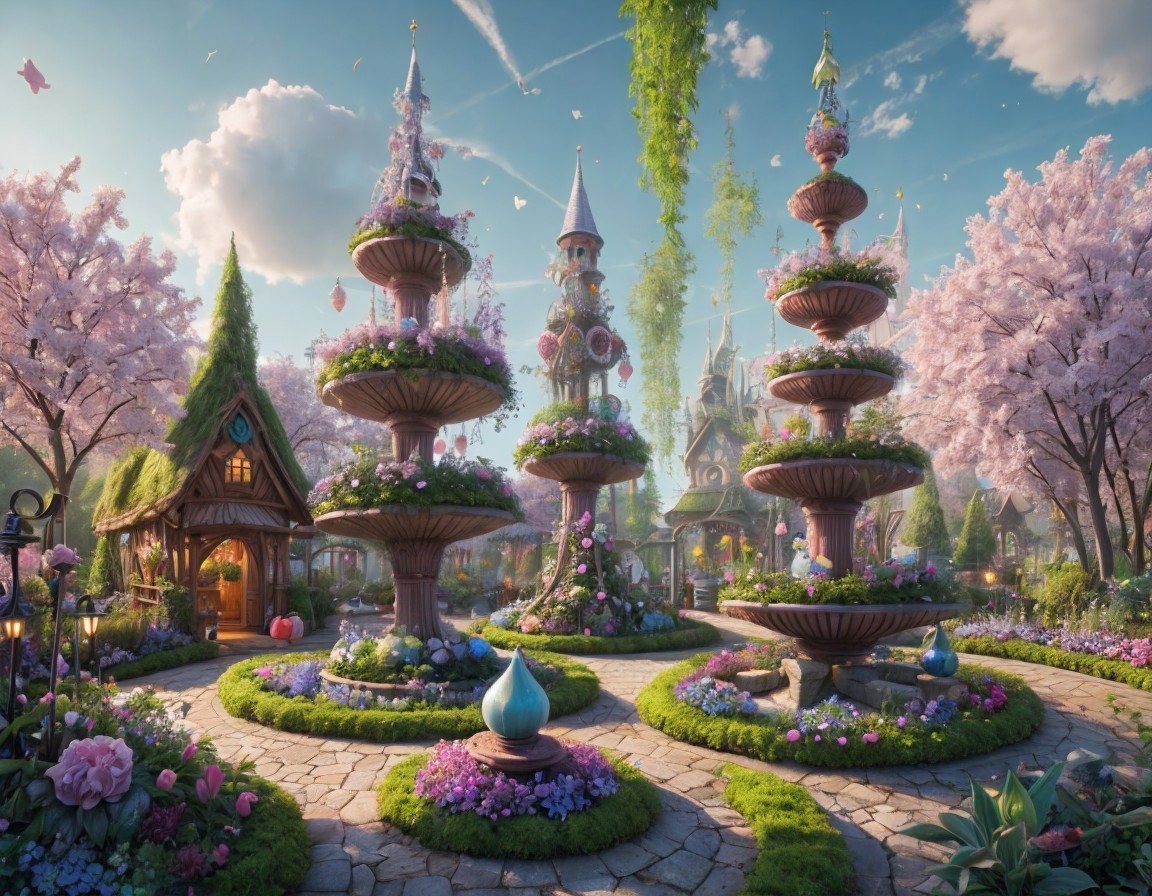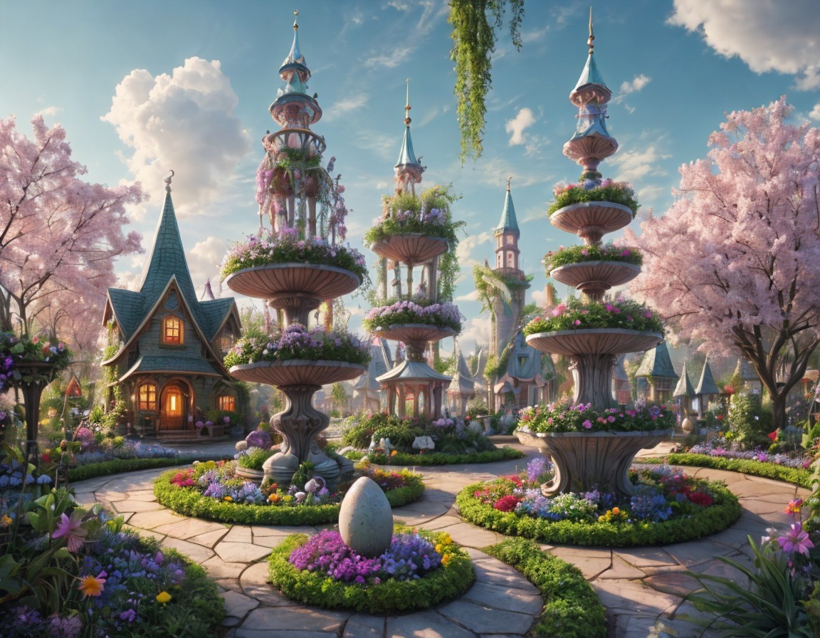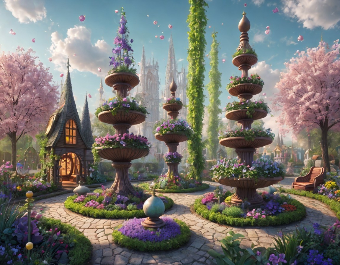 A whimsical garden features ornate fountains surrounded by lush flowers and cherry blossom trees, with a charming cottage and distant castle, creating a serene, fairytale atmosphere.