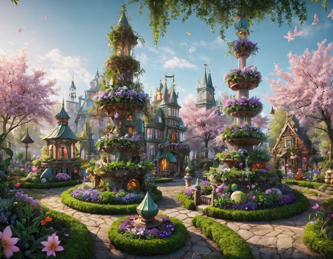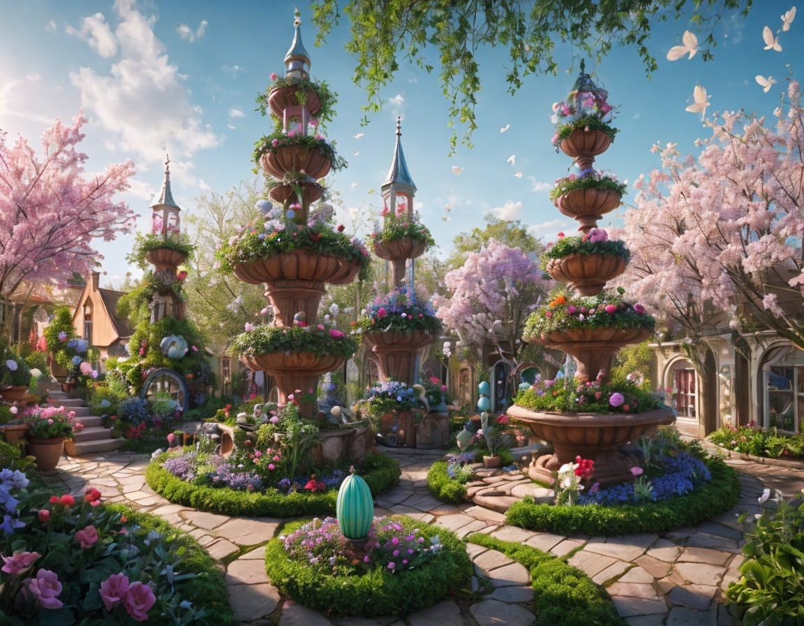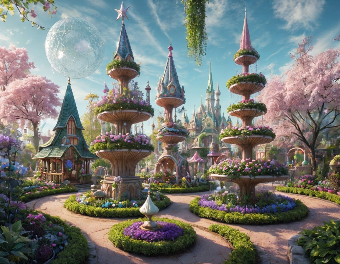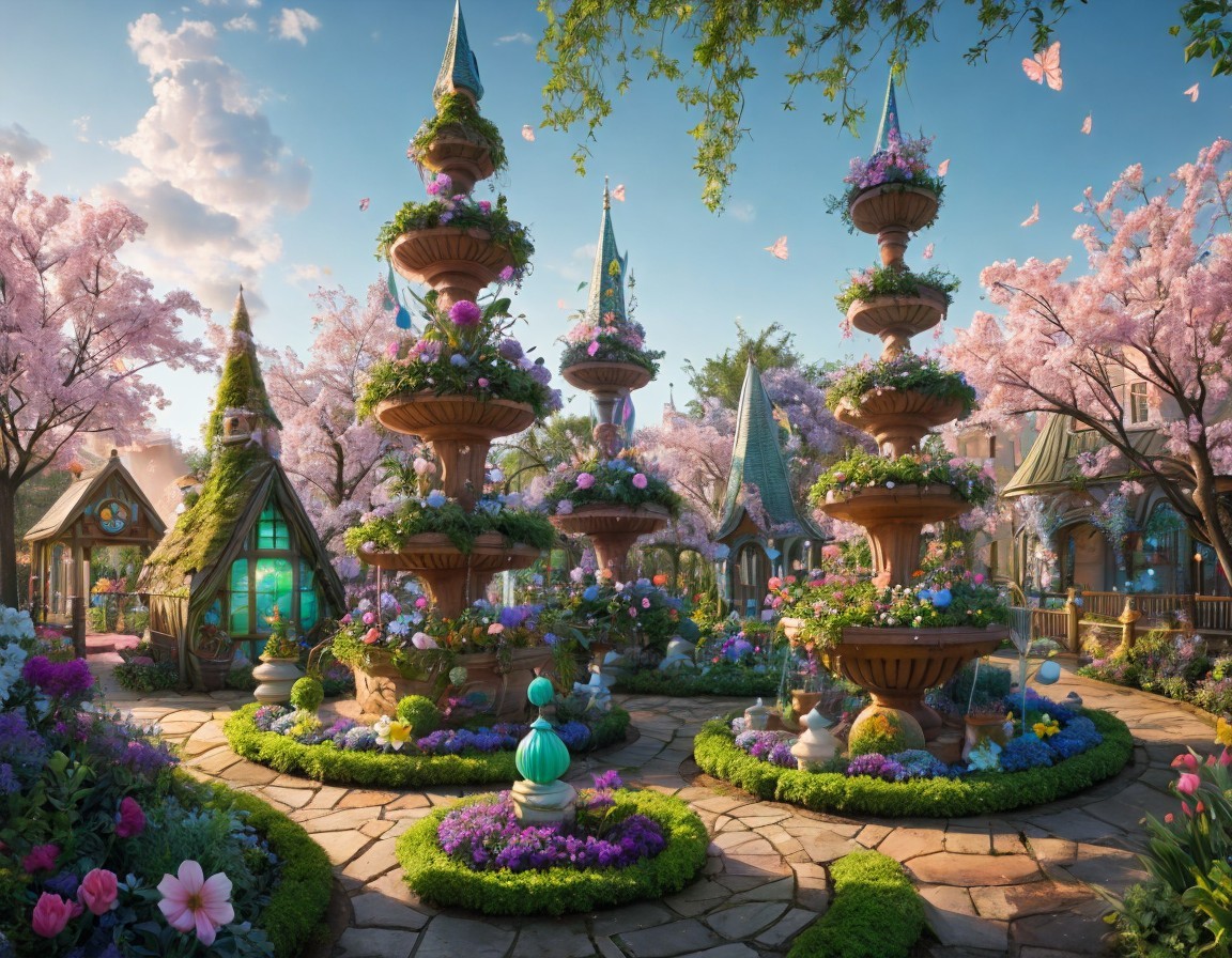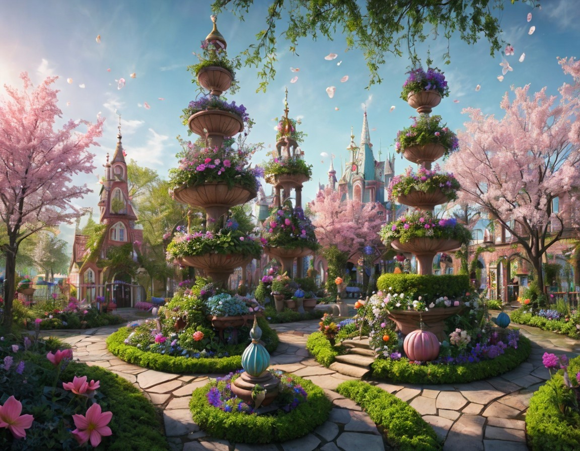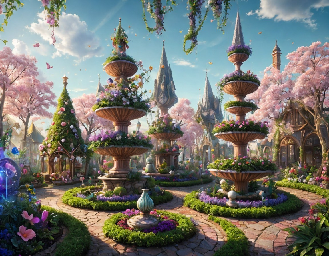 A whimsical garden features ornate fountains surrounded by lush flowers and cherry blossom trees, with a charming cottage and distant castle, creating a serene, fairytale atmosphere.