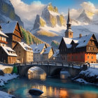 A picturesque winter scene featuring quaint, snow-covered houses beside a serene river. A charming bridge connects the two sides, with majestic mountains rising in the background under a colorful sky.