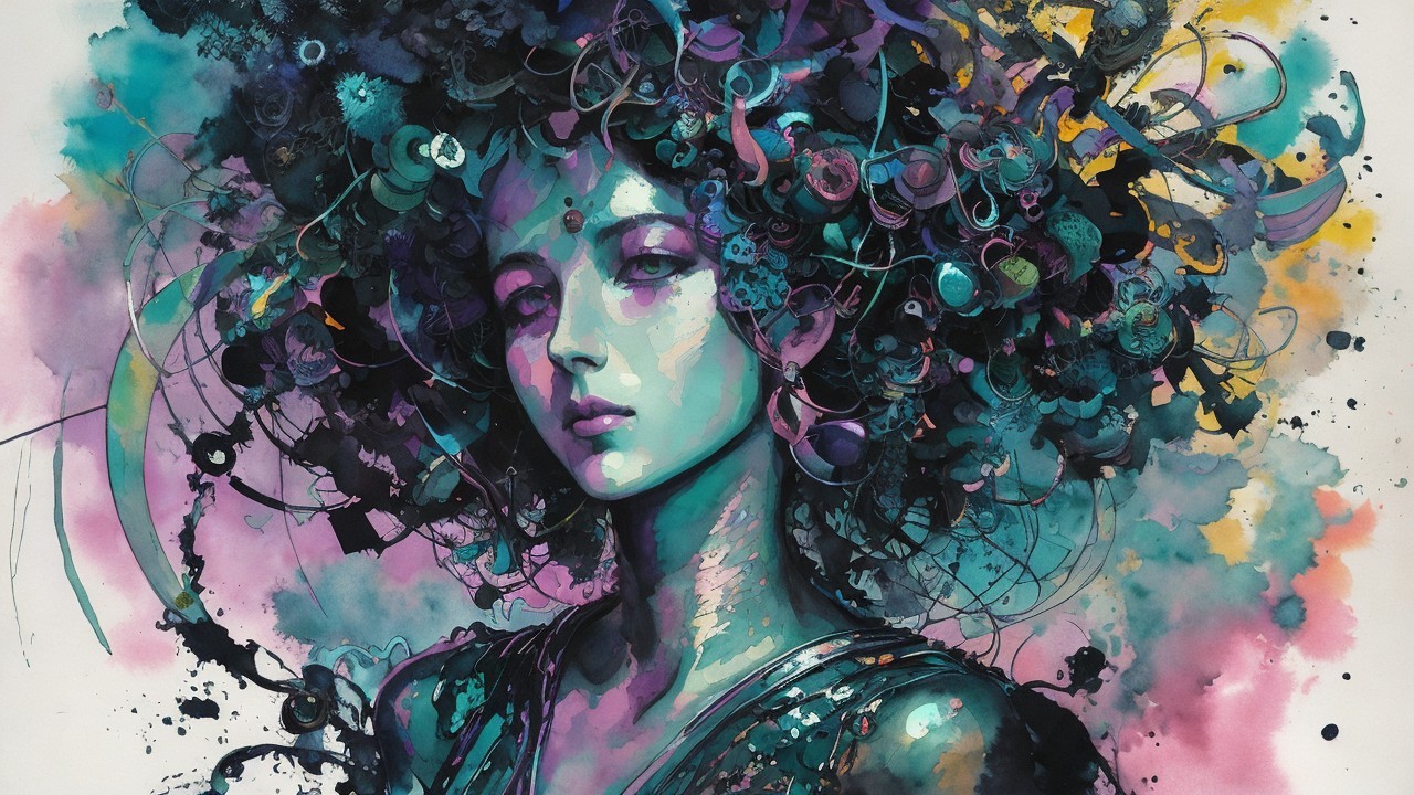 In the style of Pino Daeni. Magical nostalgia, glory, Mercury Glass patina, light and gossamer haze, topographic lines, Art Brut, moody, somber, desaturated colors. In the style of ((Arthur Rackham)), Dave Carson and John Blanche. watercolor and ink on canvas.
