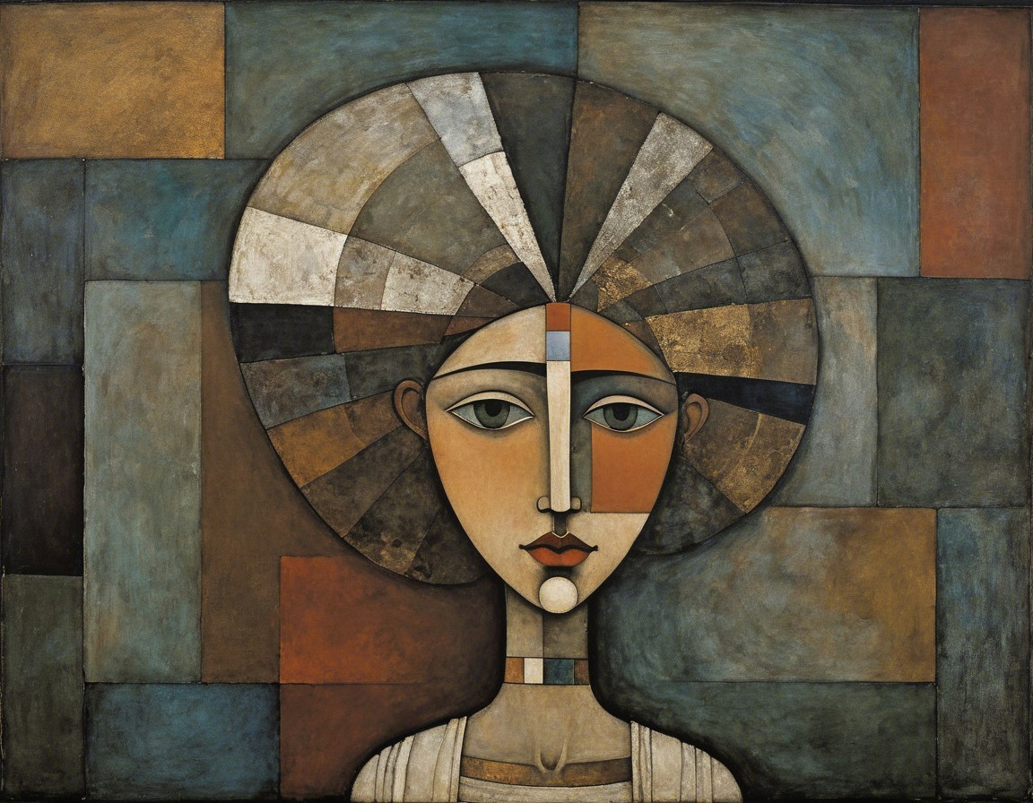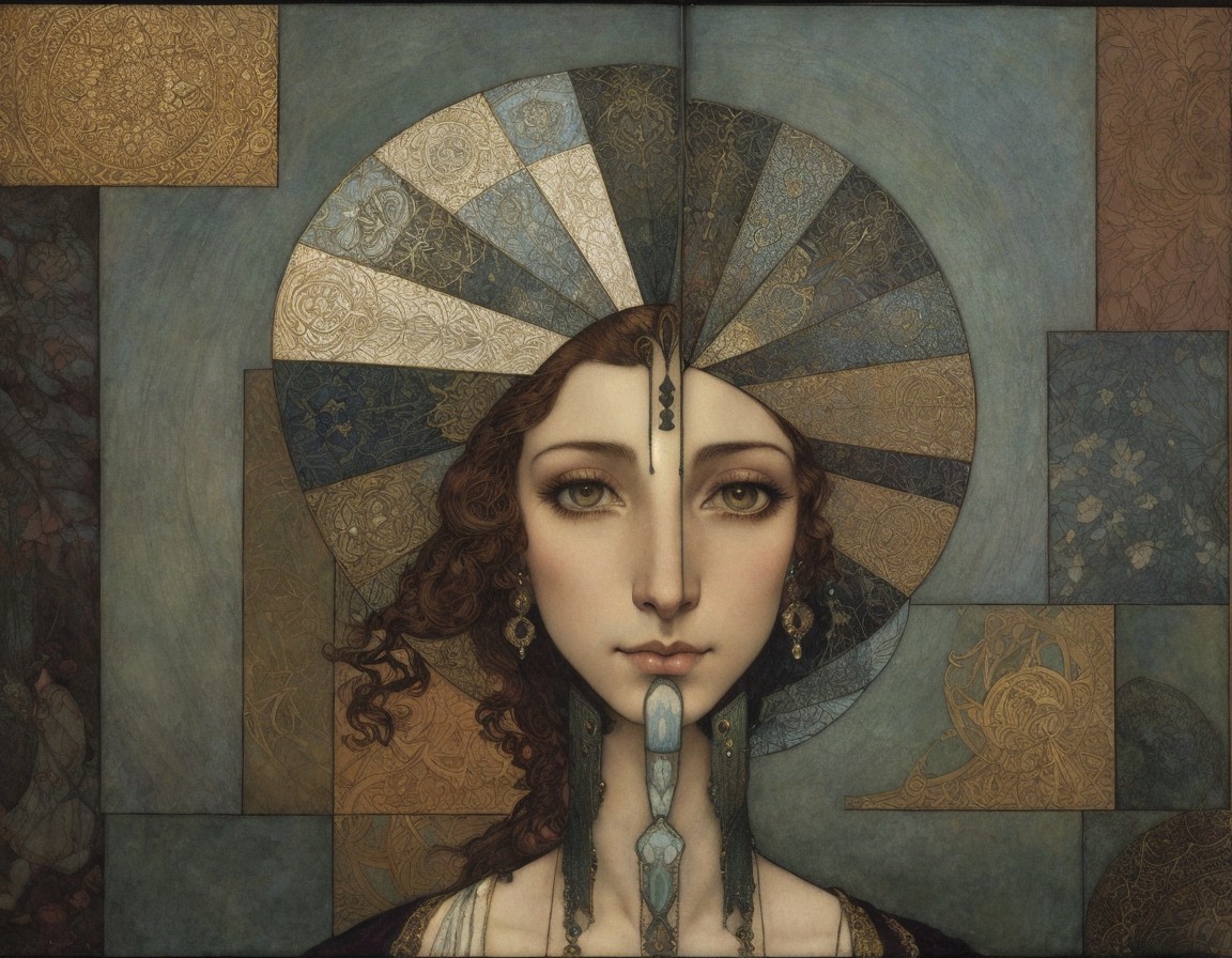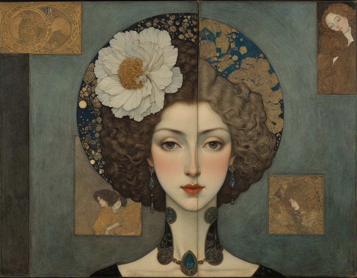 The image features a finely detailed portrait of a young woman with an elegant hairstyle adorned with large white flowers. Her soft features and gentle expression evoke a sense of tranquility.