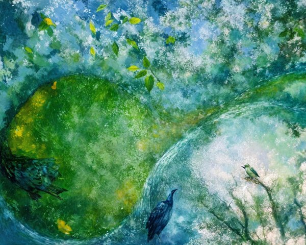 Vibrant Birds in a Serene Landscape with Lush Foliage