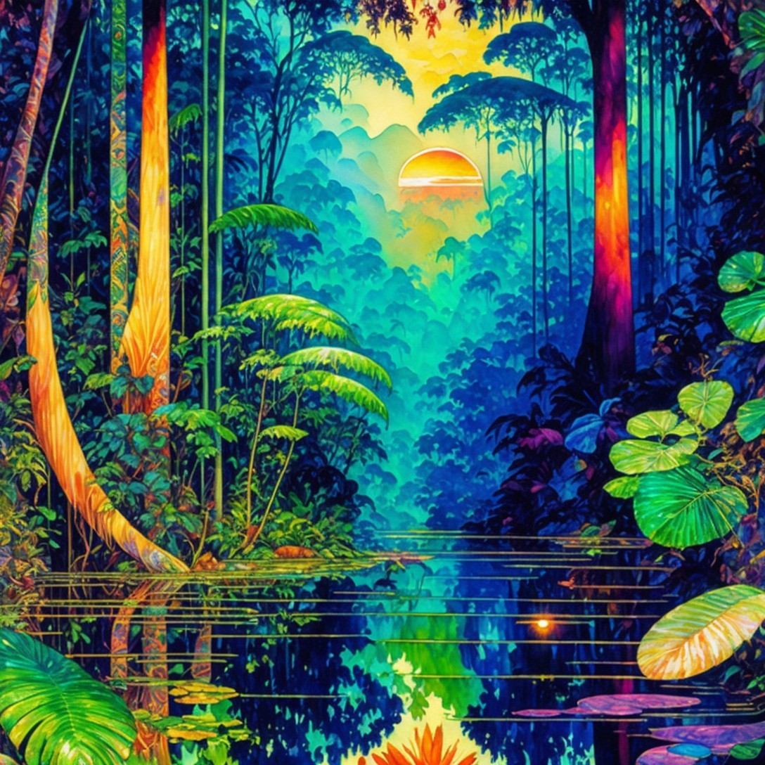 Prompt: 3D watercolor patchwork, fantastic wide view, spectacular sunrise over a beautiful Tingatinga style Rainforest jungle river, satiny, high quality, shimmering, elegant, with vibrant spectacular colors, elegant, highly detailed, glistening magic style, by Alphonse Mucha
