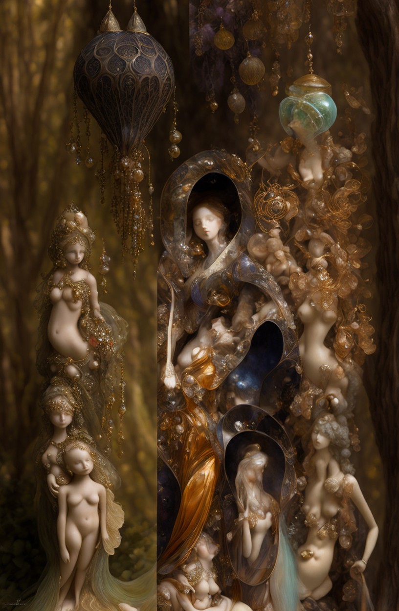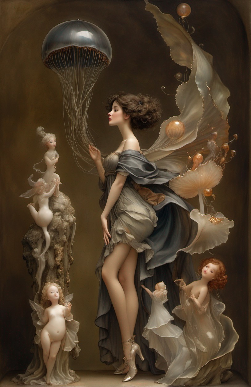 A painting-style image depicting a woman in flowing robes amidst ethereal jellyfish, resembling a classical underwater fantasy scene.