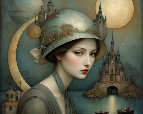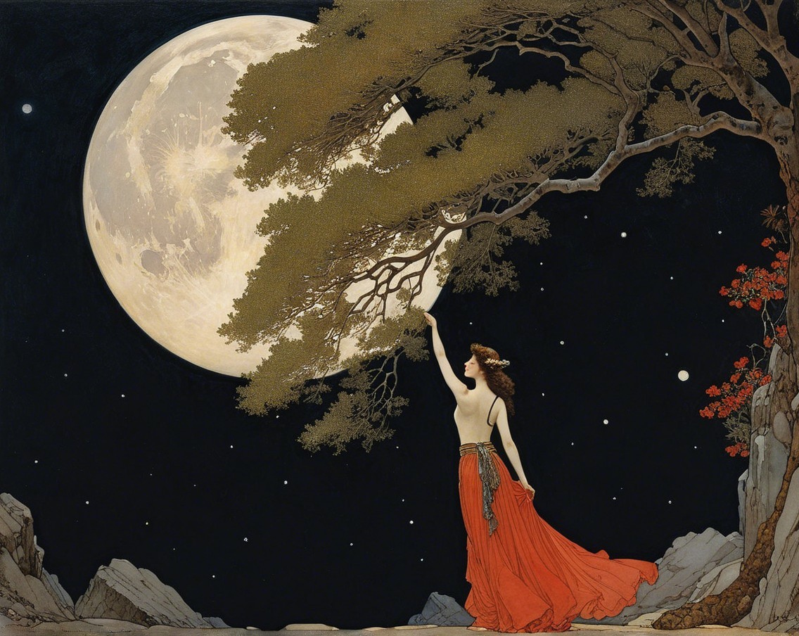 A serene woman in a flowing gown stands under a large moon, holding a staff. Palm trees frame the scene, creating a mystical atmosphere in a starlit night.