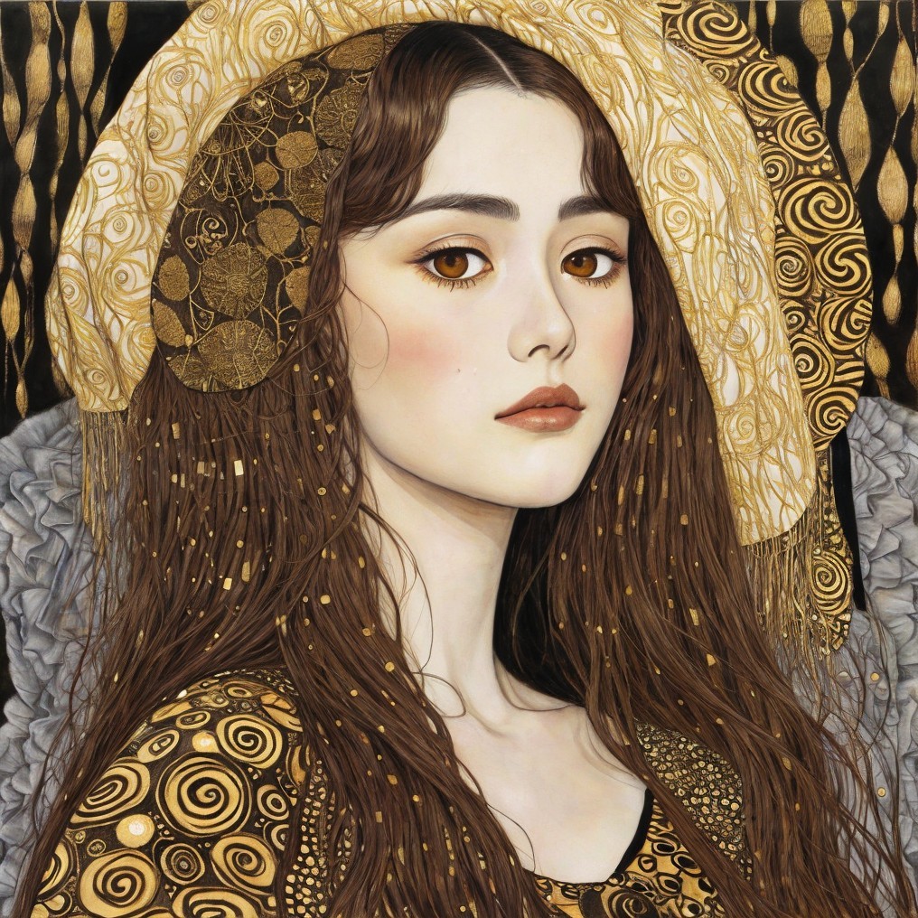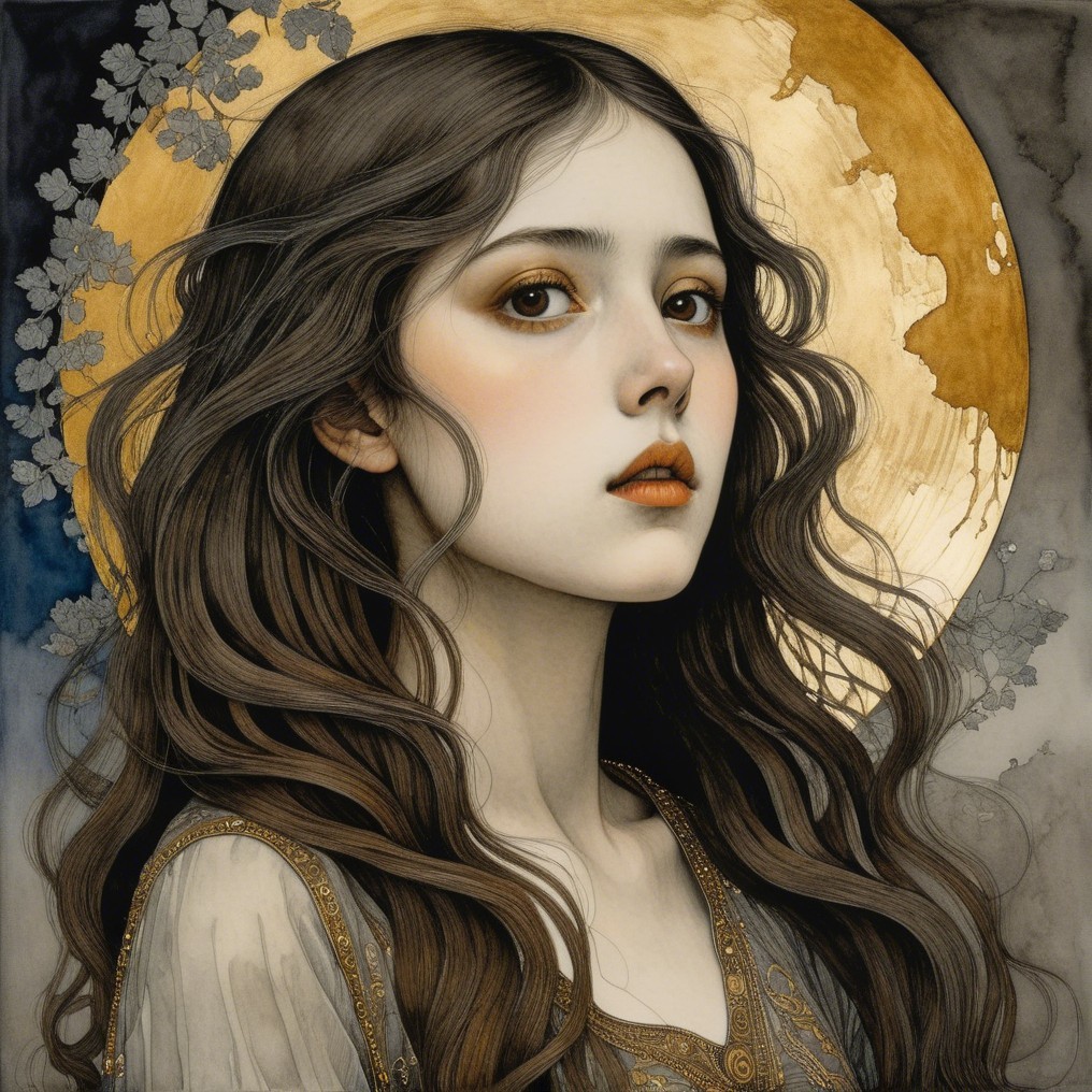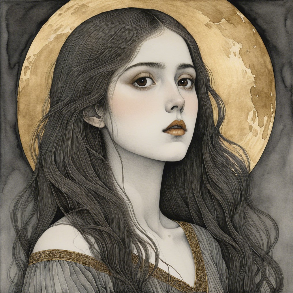 A serene portrait of a young woman with long dark hair, highlighted by a golden halo. She wears an intricately designed garment, exuding an air of elegance and mystery against a dark background.