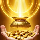 A pair of hands holds a mound of shiny gold coins beneath a radiant golden light. Atop the coins rests a gleaming, pyramid-shaped gold bar, exuding luxury and wealth.