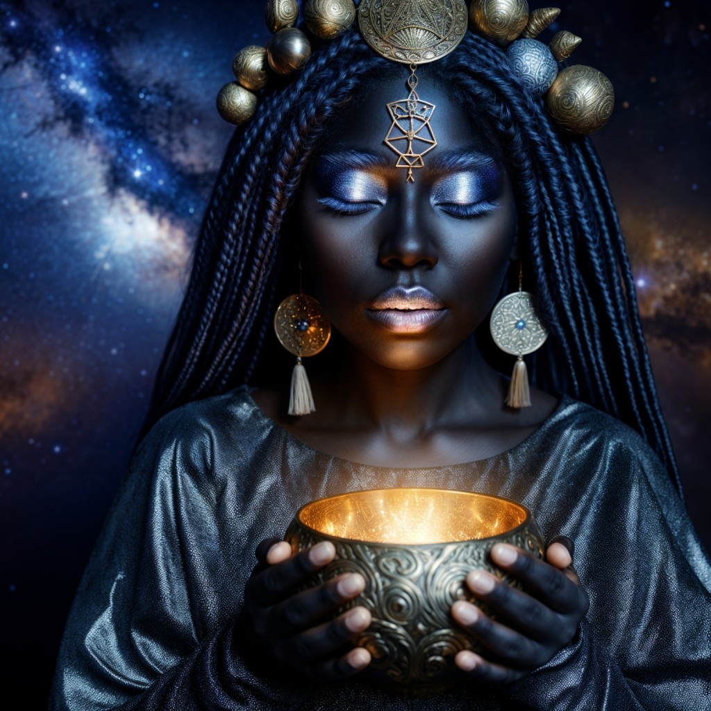 A woman with intricate braids and a striking crown gazes deeply, holding a glowing bowl. Her vibrant makeup and celestial background evoke a mystical atmosphere of cosmic wonder.