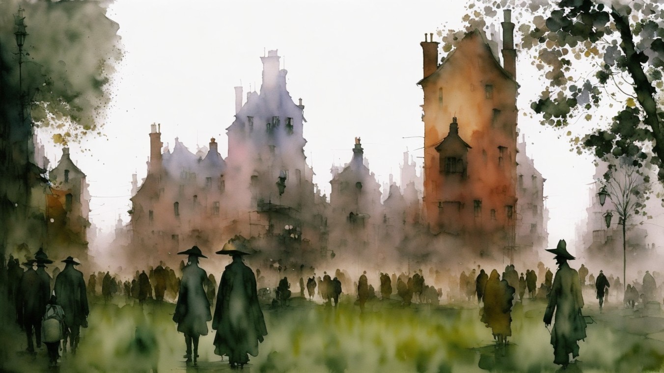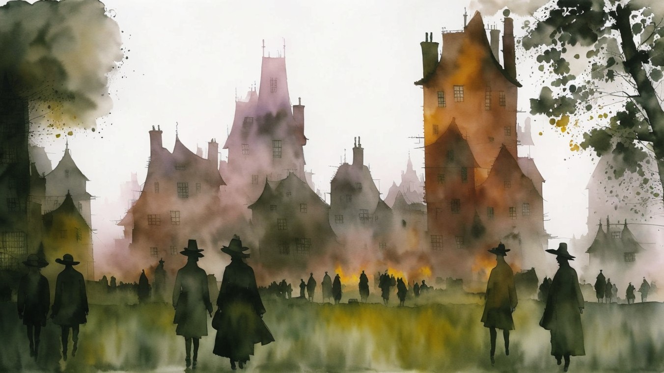 A watercolor of shadowy figures facing a misty, colorful townscape with burning buildings. From own image.