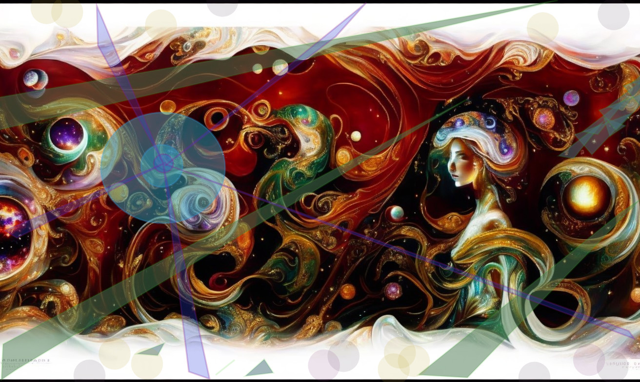 A ethereal woman in a flowing dress walks through a cosmic landscape filled with swirling planets and galaxies, framed by a large clock, symbolizing the passage of time in the universe.