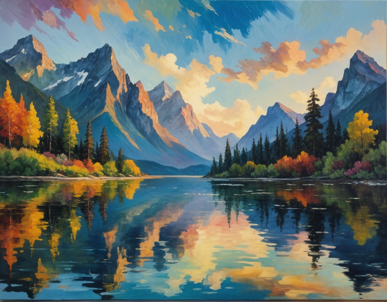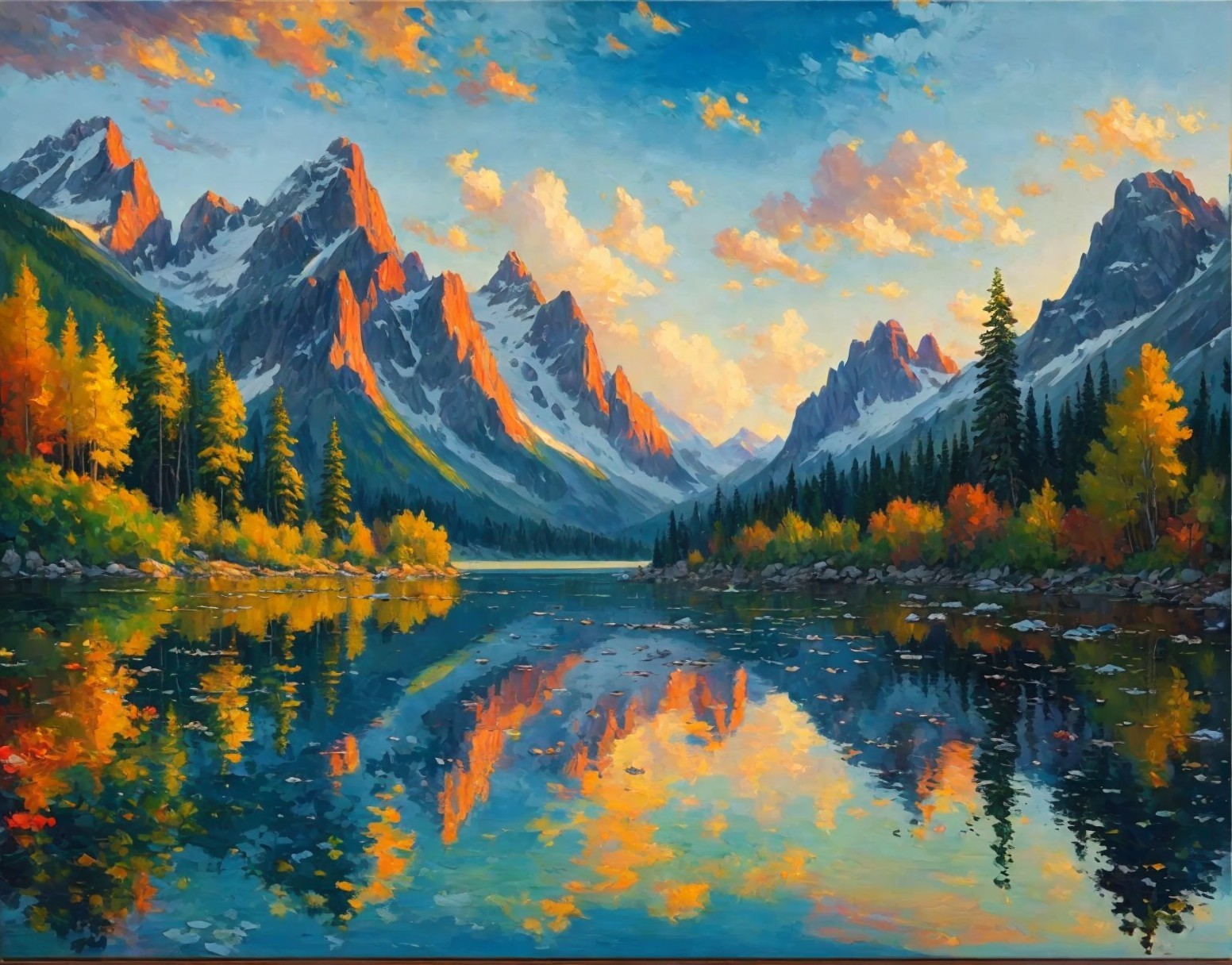 A stunning landscape featuring majestic mountains bathed in golden sunlight, reflecting on a serene lake. Vibrant autumn foliage frames the scene, enhancing the picturesque beauty.