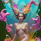 A model with vibrant, intricate body paint in bold colors poses against an abstract background featuring playful shapes and designs, blending art and fashion in a striking visual display.