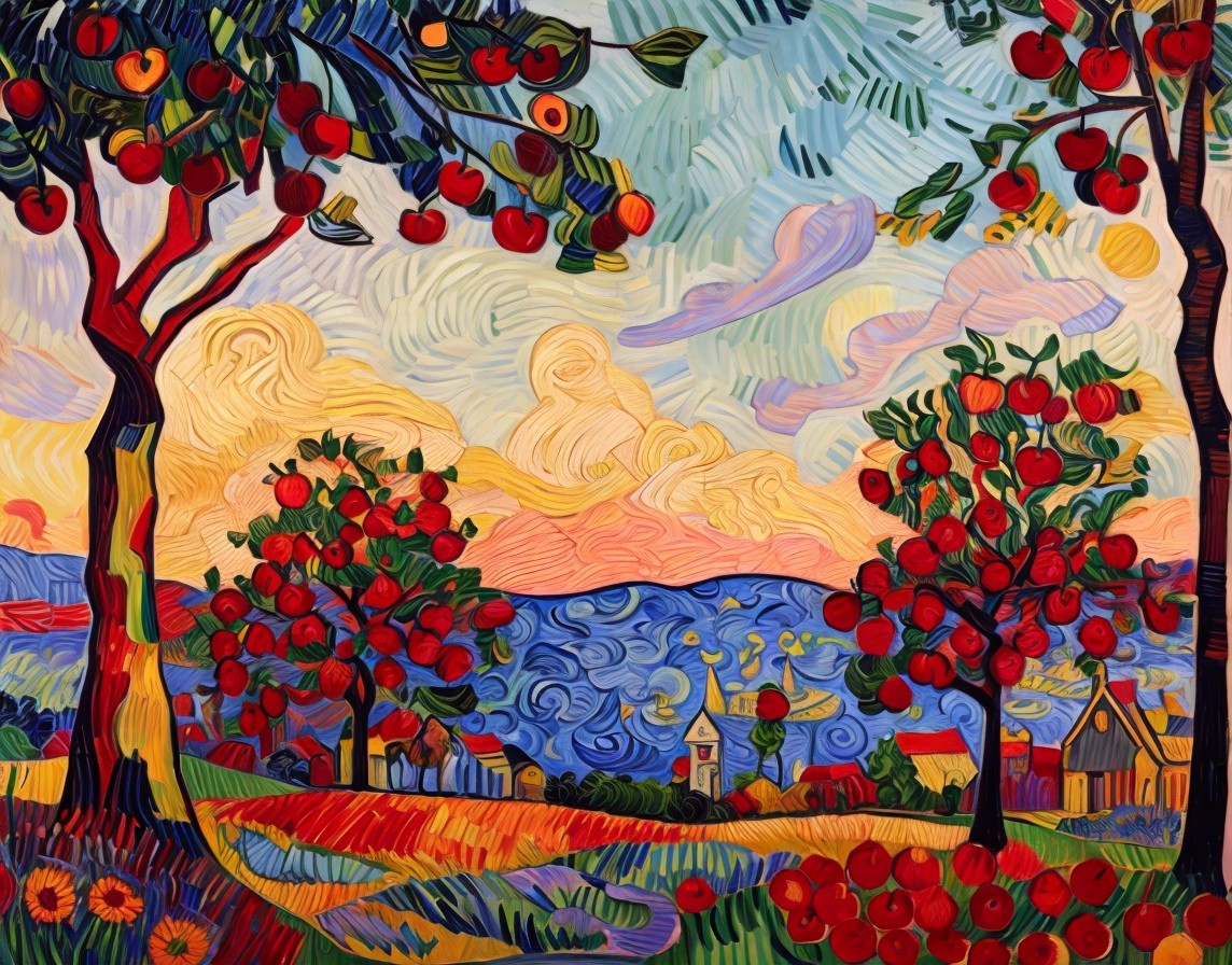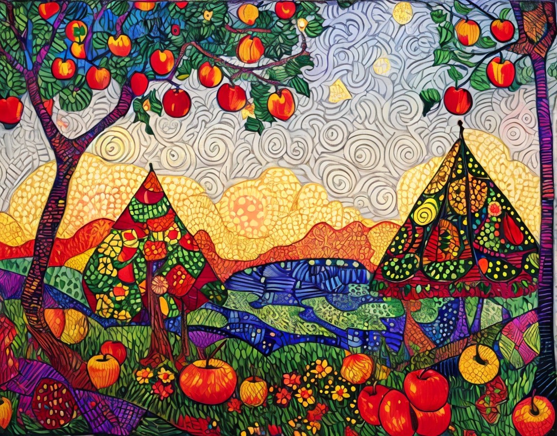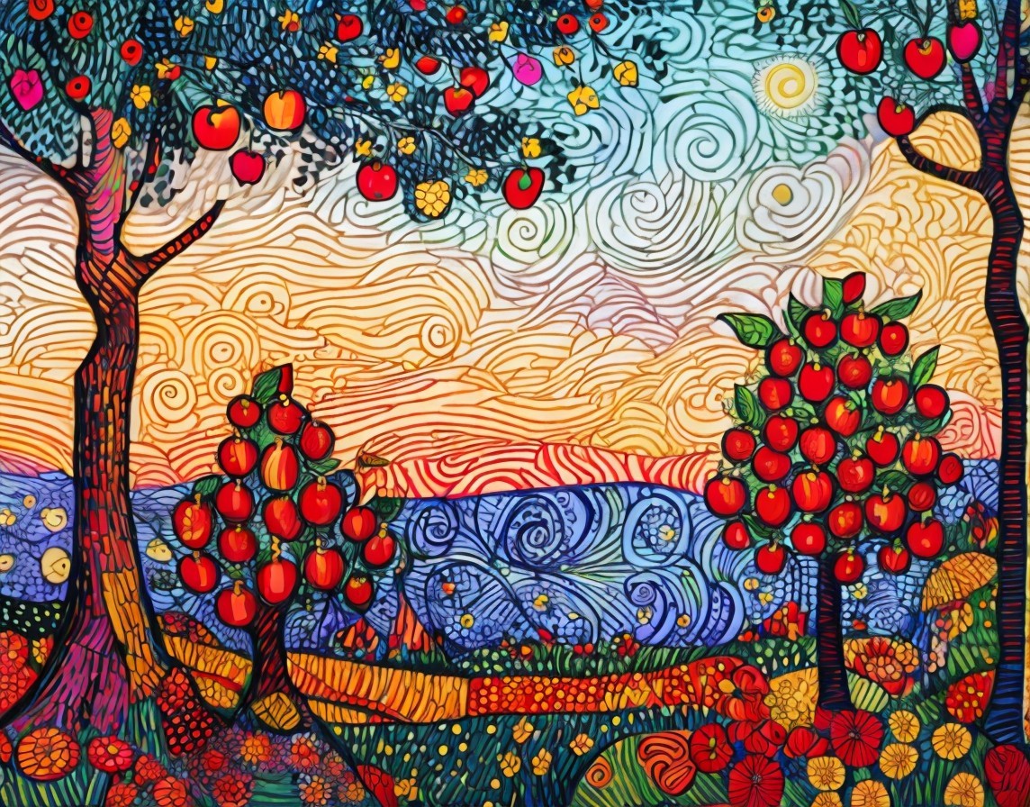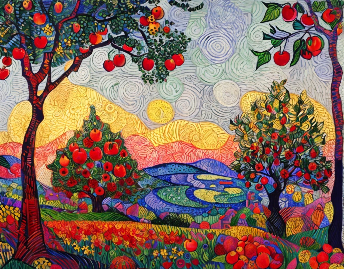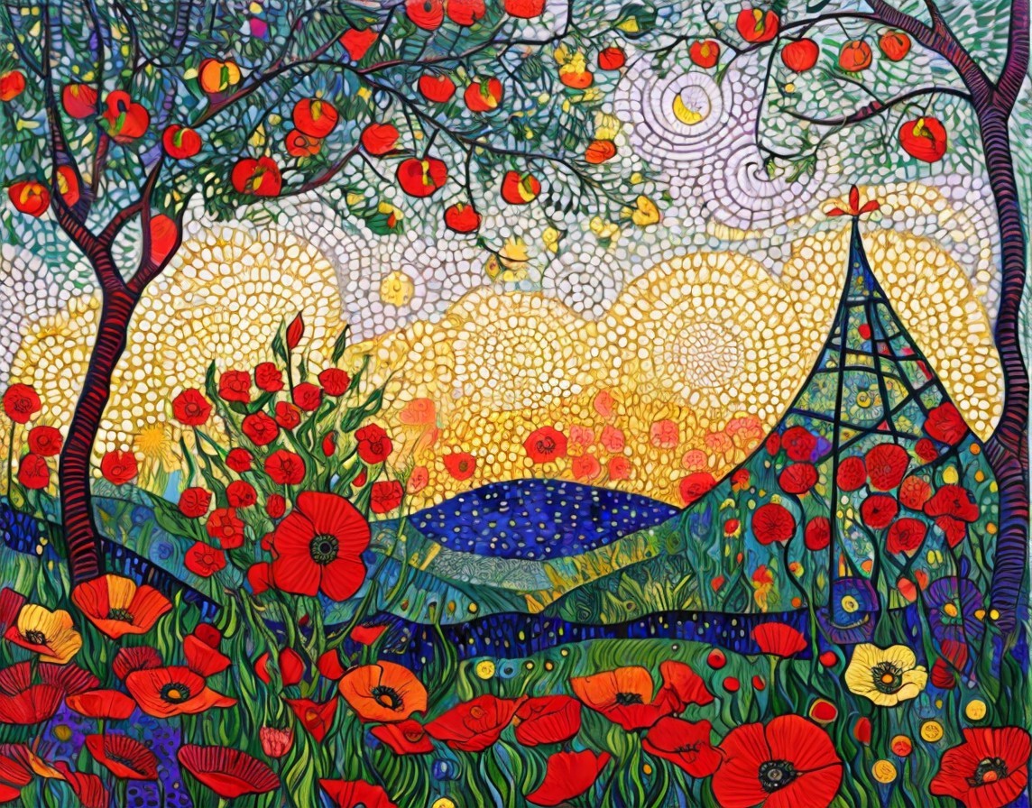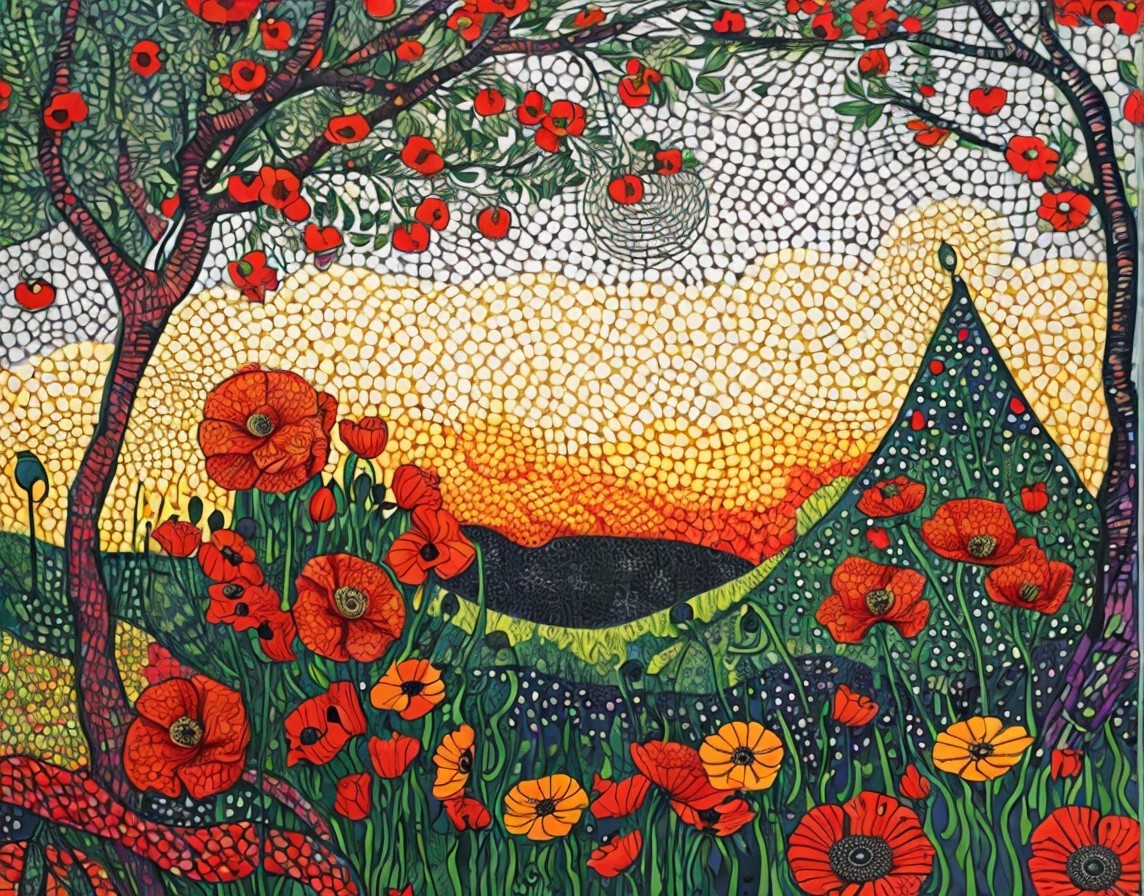 Colorful illustration of cats amid vibrant flowers with whimsical trees and a heart-shaped background.
