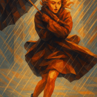 Geometric Illustration of Woman in Brown Coat and Umbrella