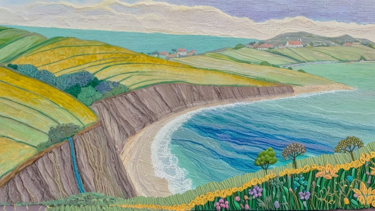 A vibrant landscape features quaint houses atop a hill, overlooking a sparkling ocean. Rolling waves crash against rocky cliffs, while colorful flowers dot the foreground, enhancing the serene scenery.