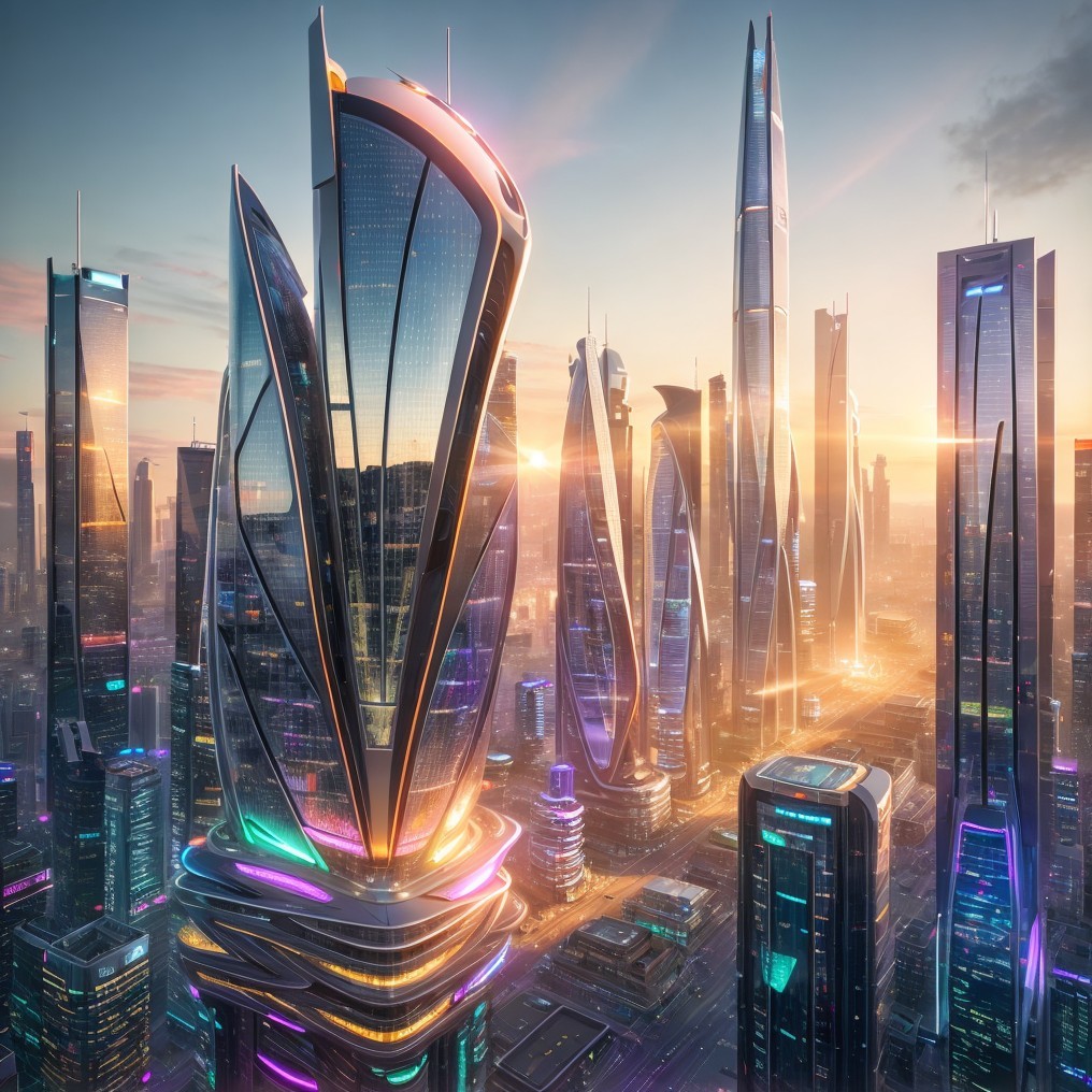 Futuristic cityscape at sunset with neon-lit skyscrapers and a dynamic sky.