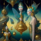 This surreal artwork features ethereal figures adorned with intricate, ornate hairstyles and metallic accents, set against a gradient sky. The composition blends fantasy and elegance vividly.