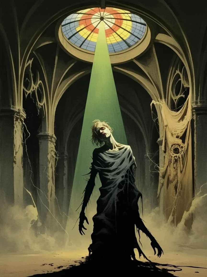 A figure stands dramatically in a dim, grand space, illuminated by a shaft of light from a stained glass dome above. The atmosphere is dark and moody, evoking a sense of mystery and introspection.