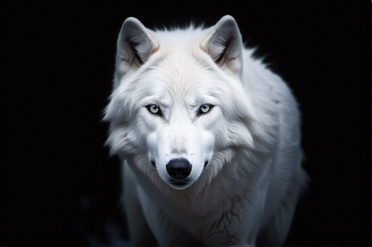 Digital Art of a White Wolf with Blue Eyes and Snowflakes