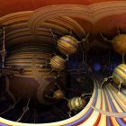 A mesmerizing, surreal landscape featuring ornate, swirling structures and golden spheres, all set against a rich, cosmic backdrop that evokes a sense of depth and tranquility.