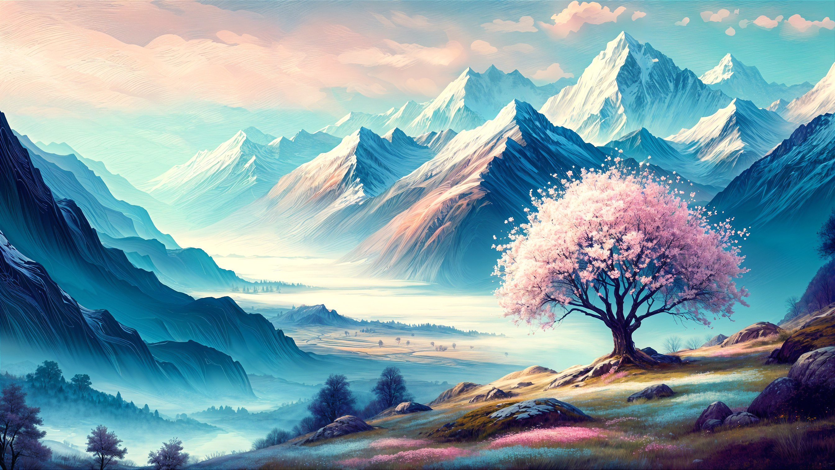 Description: This enchanting landscape captures the Himalayas with snow-capped peaks under a pastel sky. A solitary blooming tree with pink flowers adds tranquility, while mist rolls over the serene valley below.