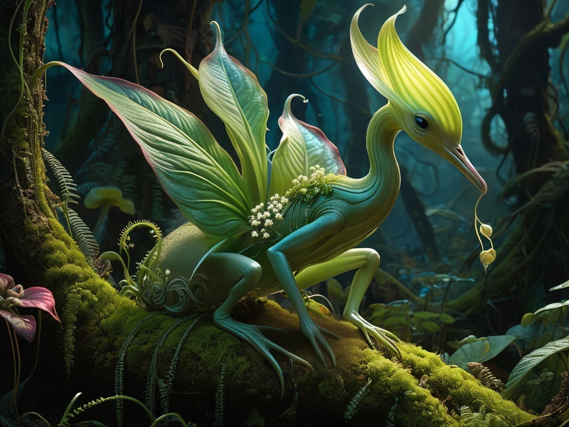 A fantastical creature blends bird and plant elements, featuring vibrant green feathers and leaf-like appendages. It perches gracefully on a mossy log in a lush, enchanted forest.