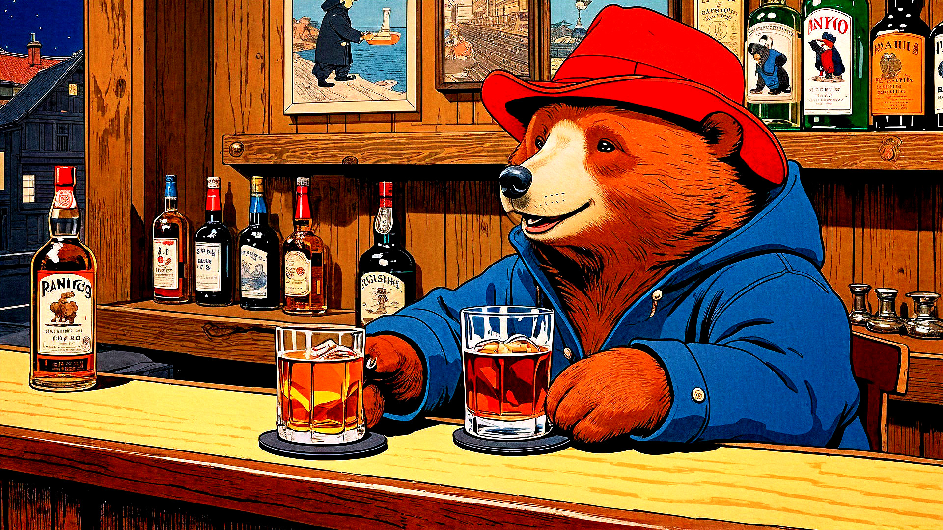 A cheerful bear in a red hat and blue jacket sits at a bar, enjoying two drinks. The warm, cozy atmosphere features shelves lined with various bottles, creating a whimsical, inviting scene.