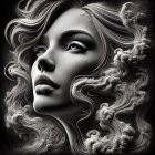 The image features a stunning model with voluminous, wavy platinum hair cascading elegantly. She has striking blue eyes and a flawless complexion, creating a captivating and ethereal look.