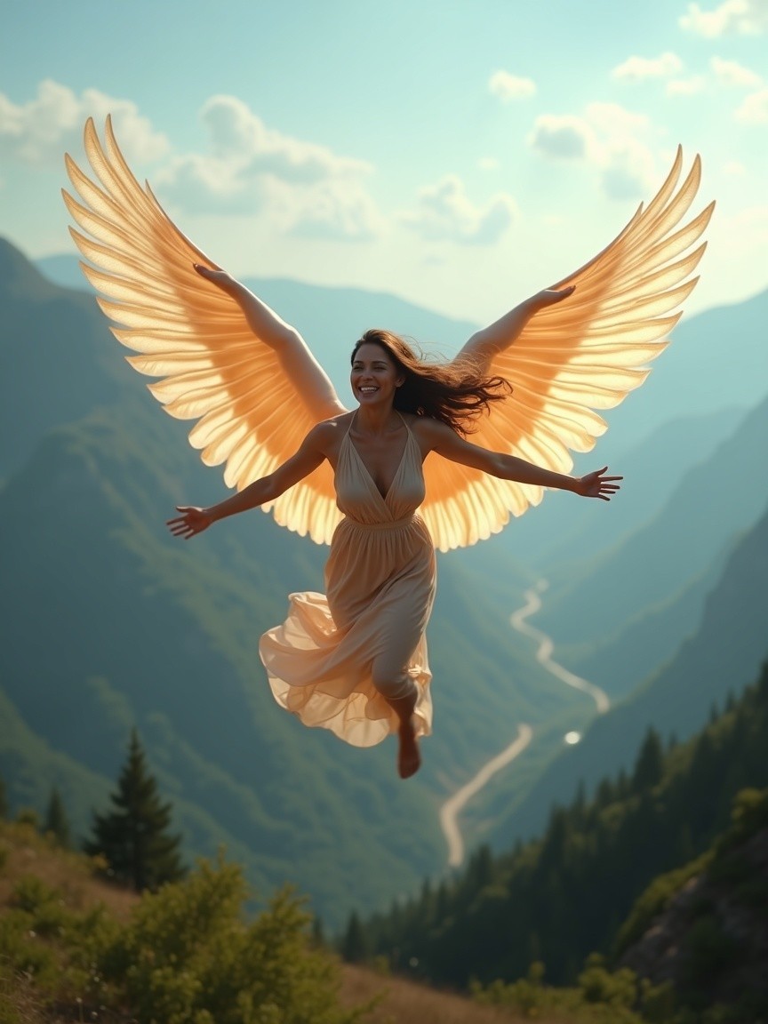 A woman with colorful, feathered wings soars above a breathtaking landscape, surrounded by mountains and a winding river. The scene captures a sense of freedom and ethereal beauty.