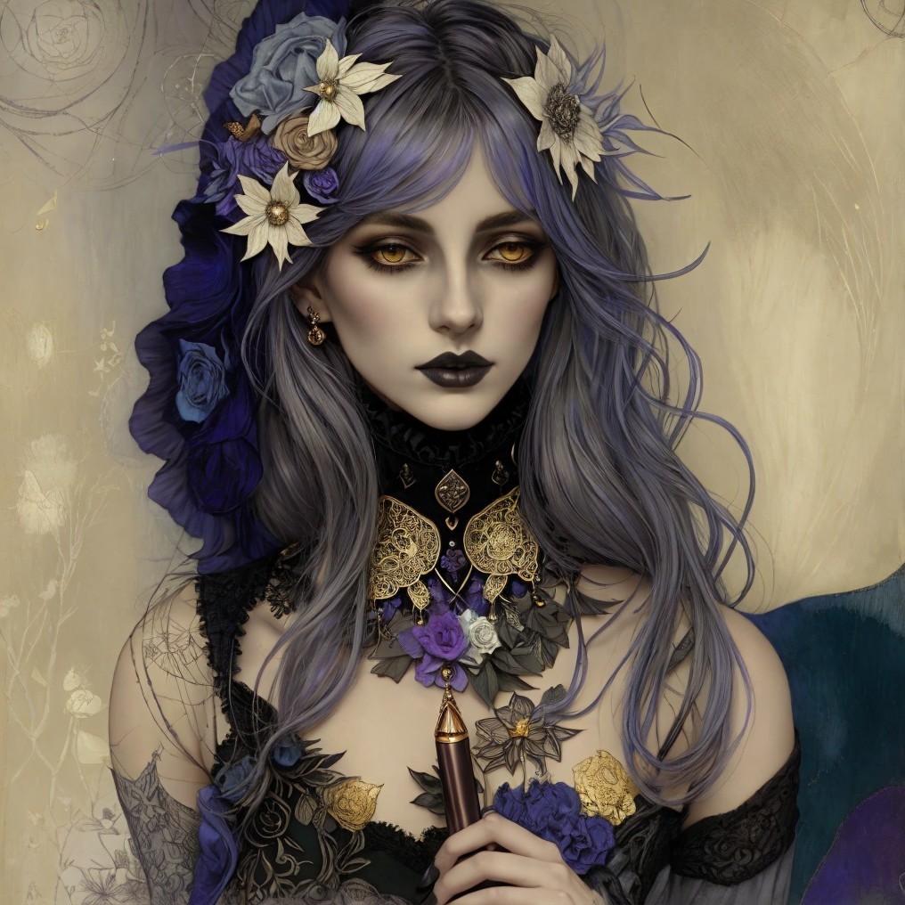 A portrait of a woman with blue hair, adorned with gold jewelry and a floral headpiece, exuding an ethereal aura.