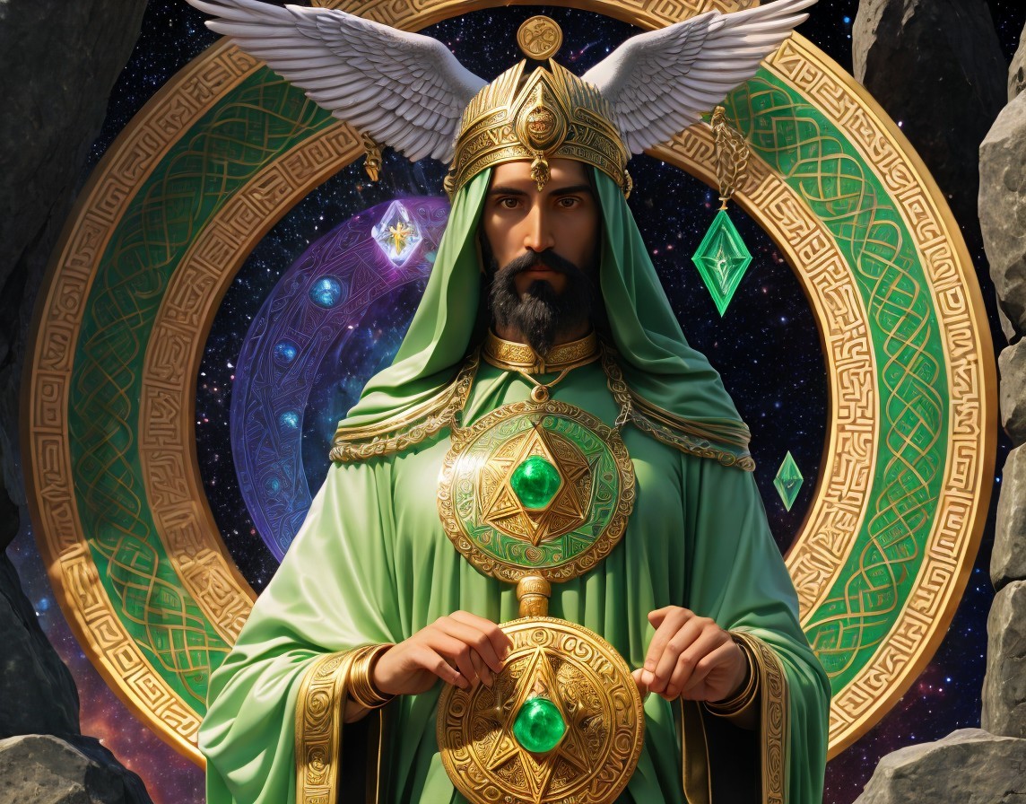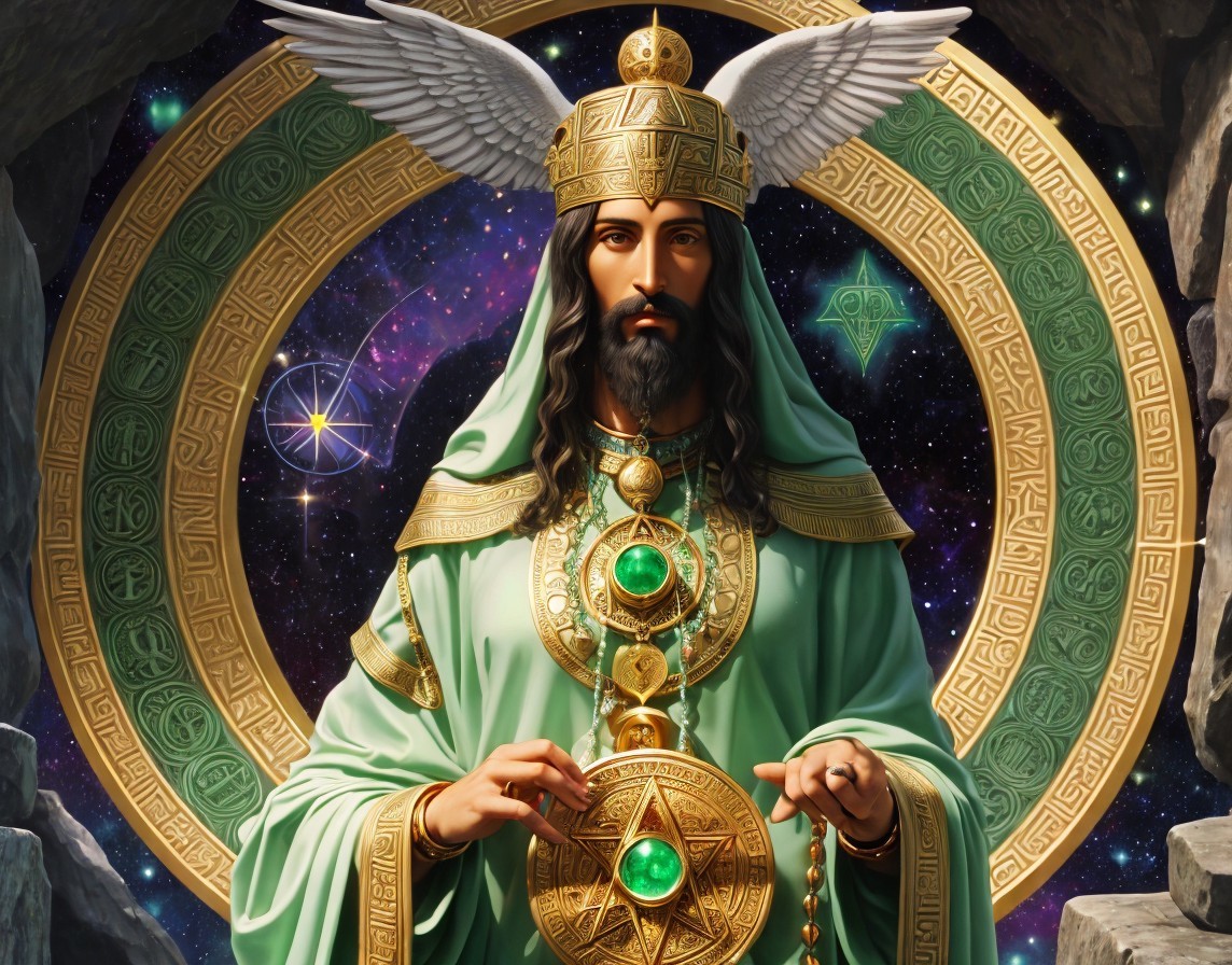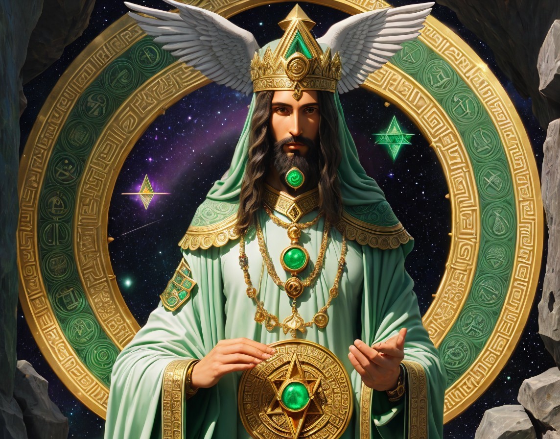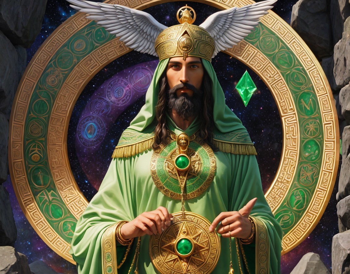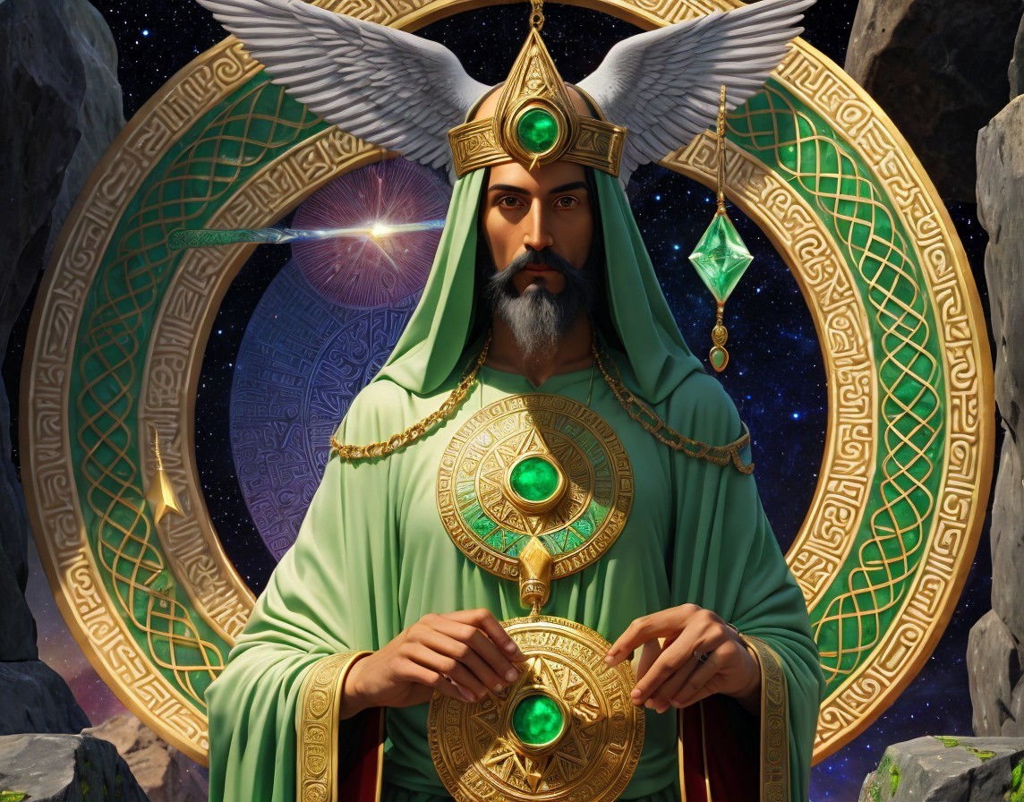 A regal figure with a winged crown, green robes, holding a staff with cosmic background.