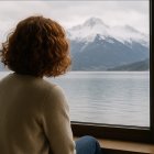 A young woman gazes thoughtfully out of a window, overlooking a serene lake and majestic mountains. Her contemplative expression reflects the beauty of nature surrounding her.