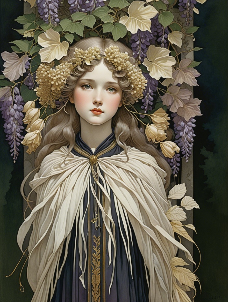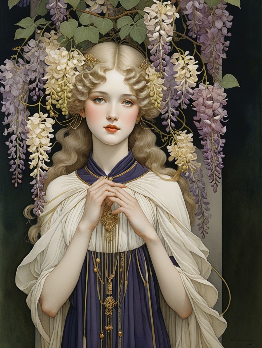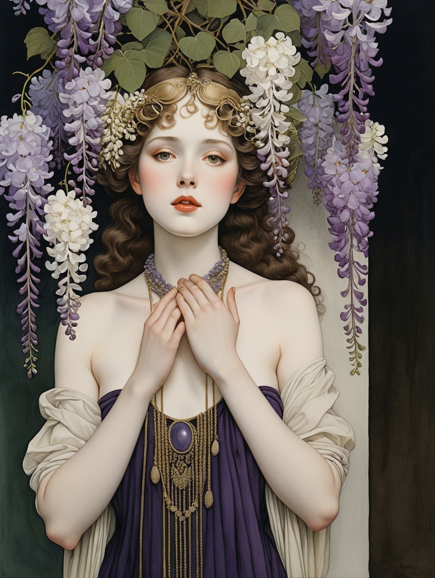 Lots of wisteria. Magical realism, illustration, clear and clean face, hand colored, wateracolor and ink, ultra detailed, dreamer with open eyes can't wake up inspired from Michael parkes, Ashley Barron, Amy Sol and Aubrey Beardsley,