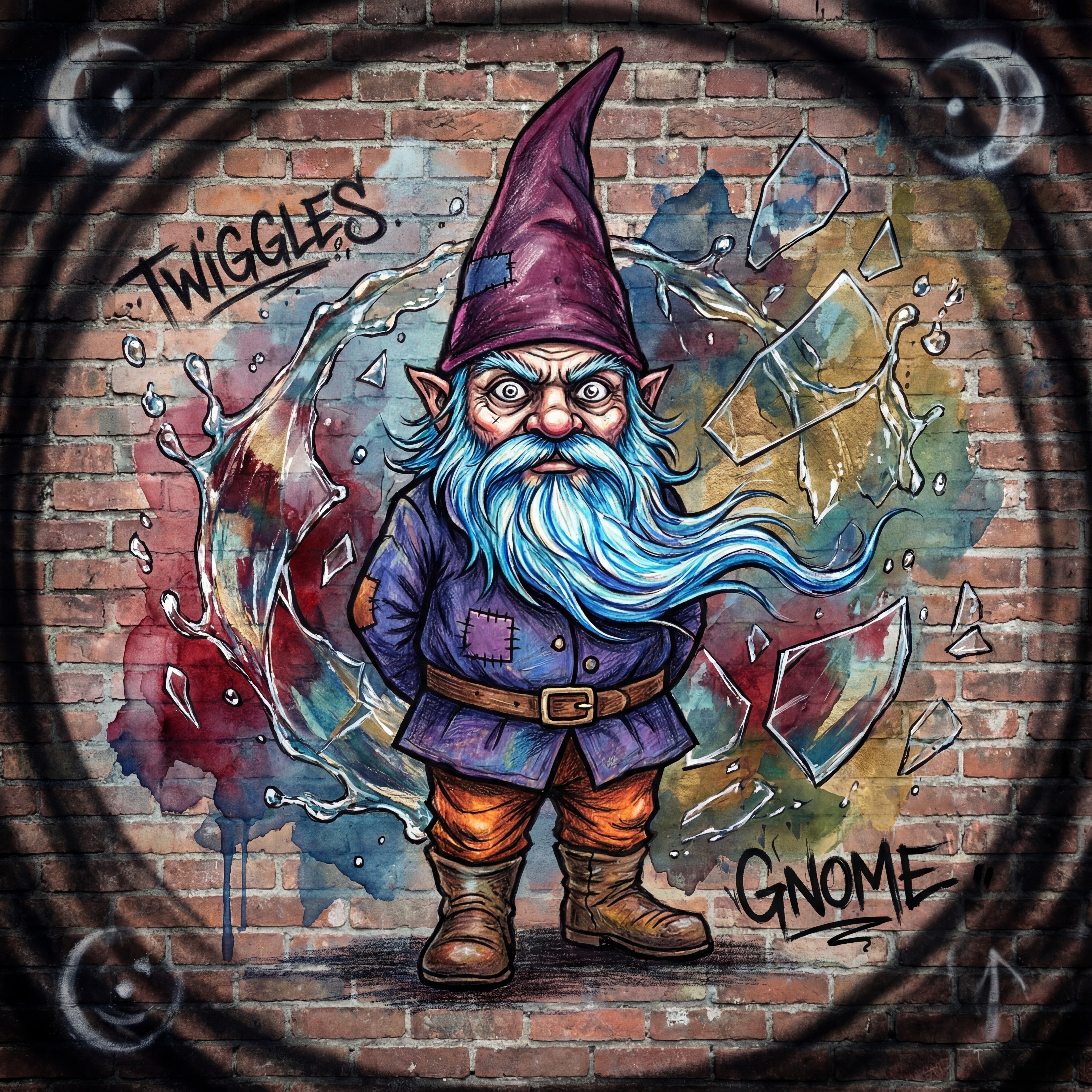 A painted illustration of a gnome with a purple hat and a vibrant light blue beard stands in the center of the image. The gnome is wearing a dark blue coat with patches and a brown belt that cinches at his waist, along with baggy orange pants and brown boots. Behind the gnome is a splash
