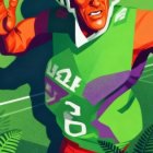 Prompt: Create a vibrant and dynamic illustration of a stylized football player in a bold, colorful uniform, featuring vivid greens and purples. The player, with an intense expression, is poised in action, as if dodging an opponent on the field. Surround the player with lush green ferns and a bright, sunny outdoor setting, emphasizing the energy of the game. The artwork should have a modern, graphic design aesthetic with strong contrasts and exaggerated features.