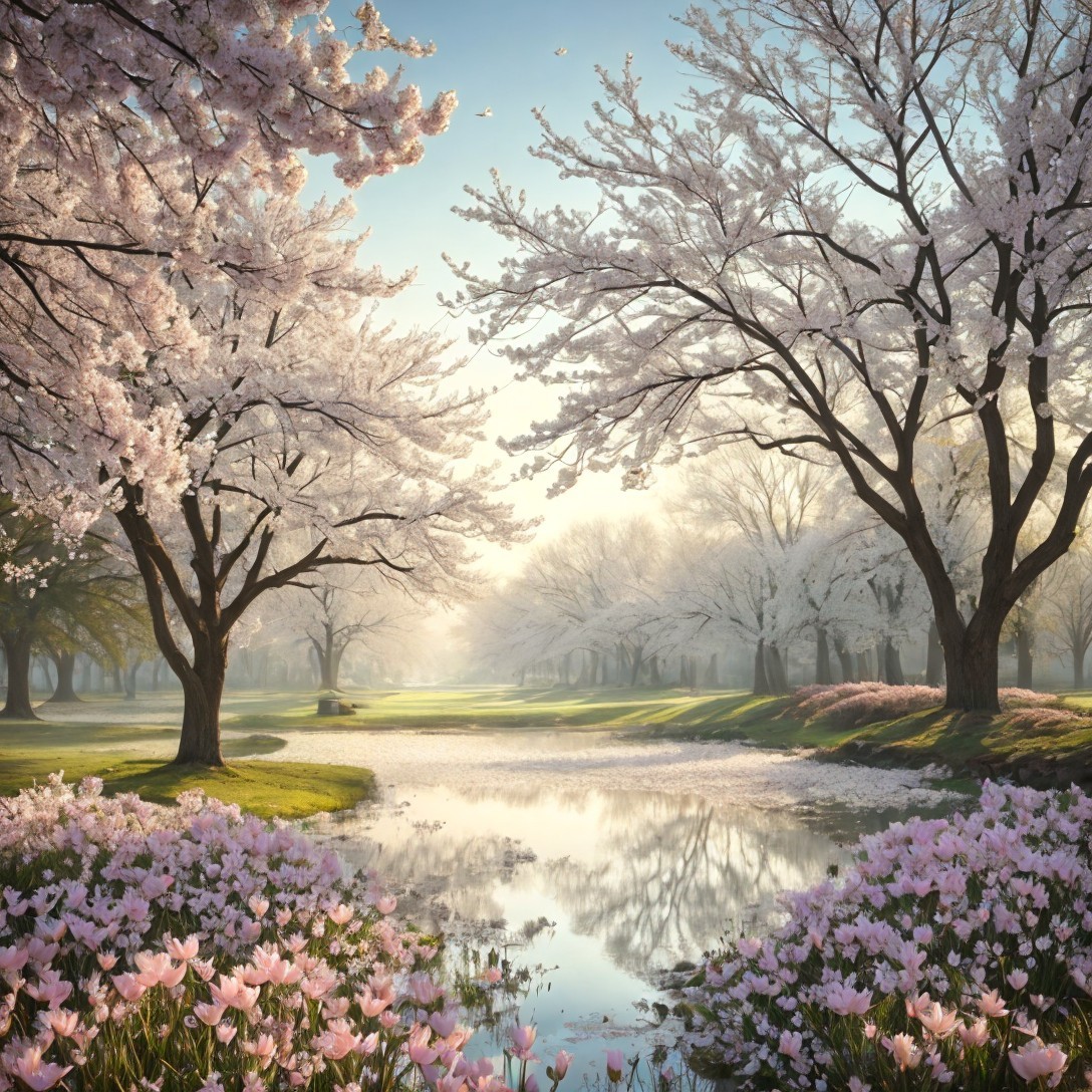 A woman in a flowing dress stands by a stream in a magical, flower-filled forest with soft, ethereal light.