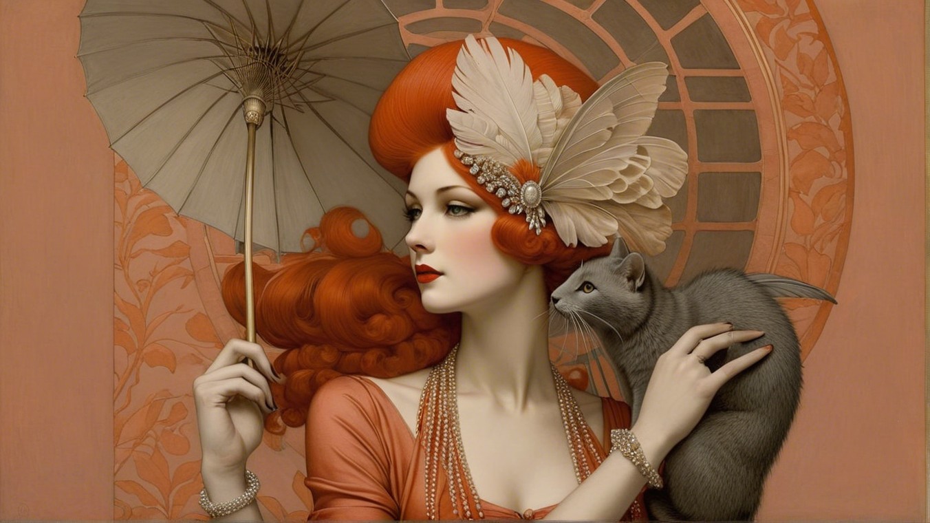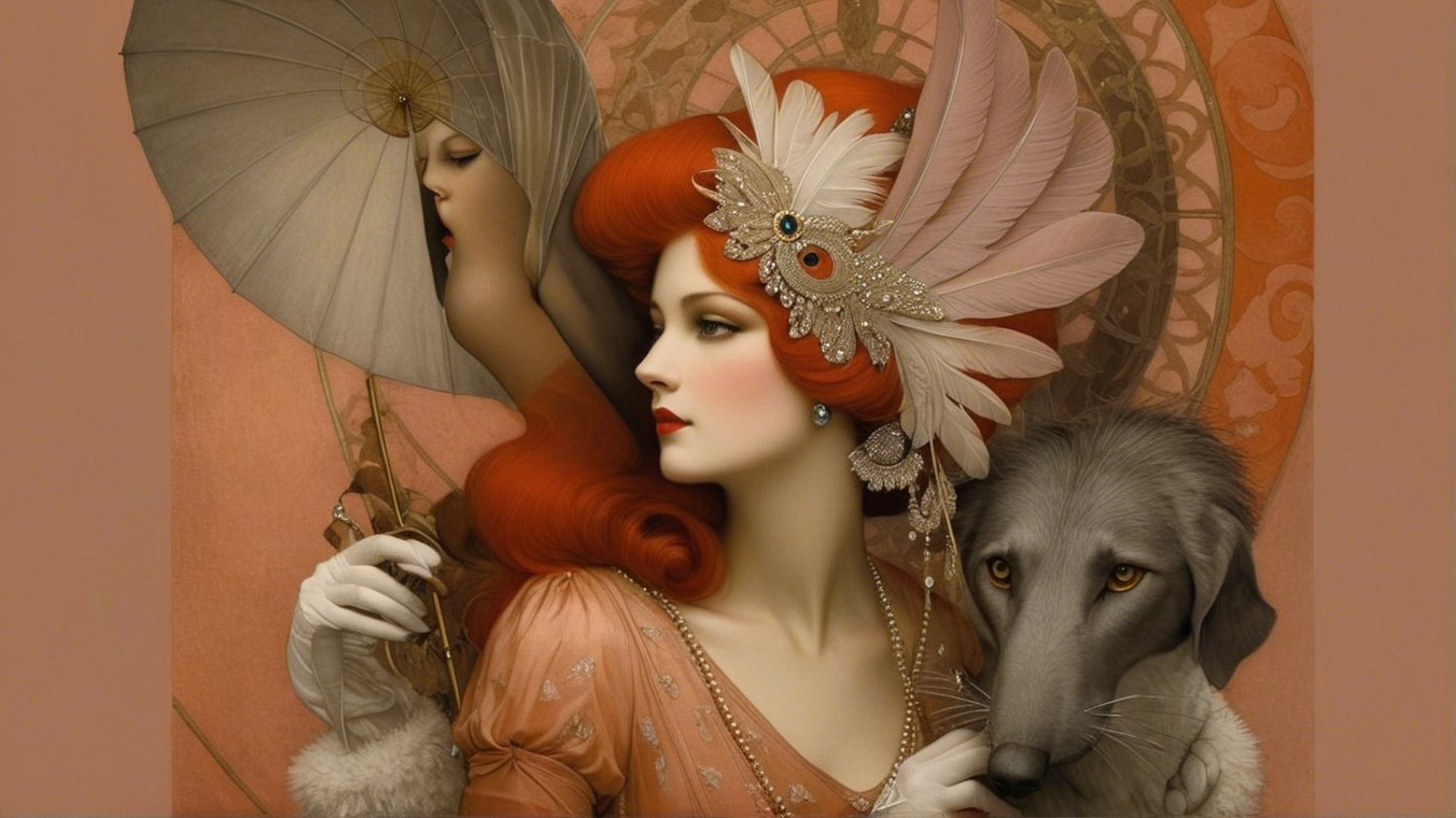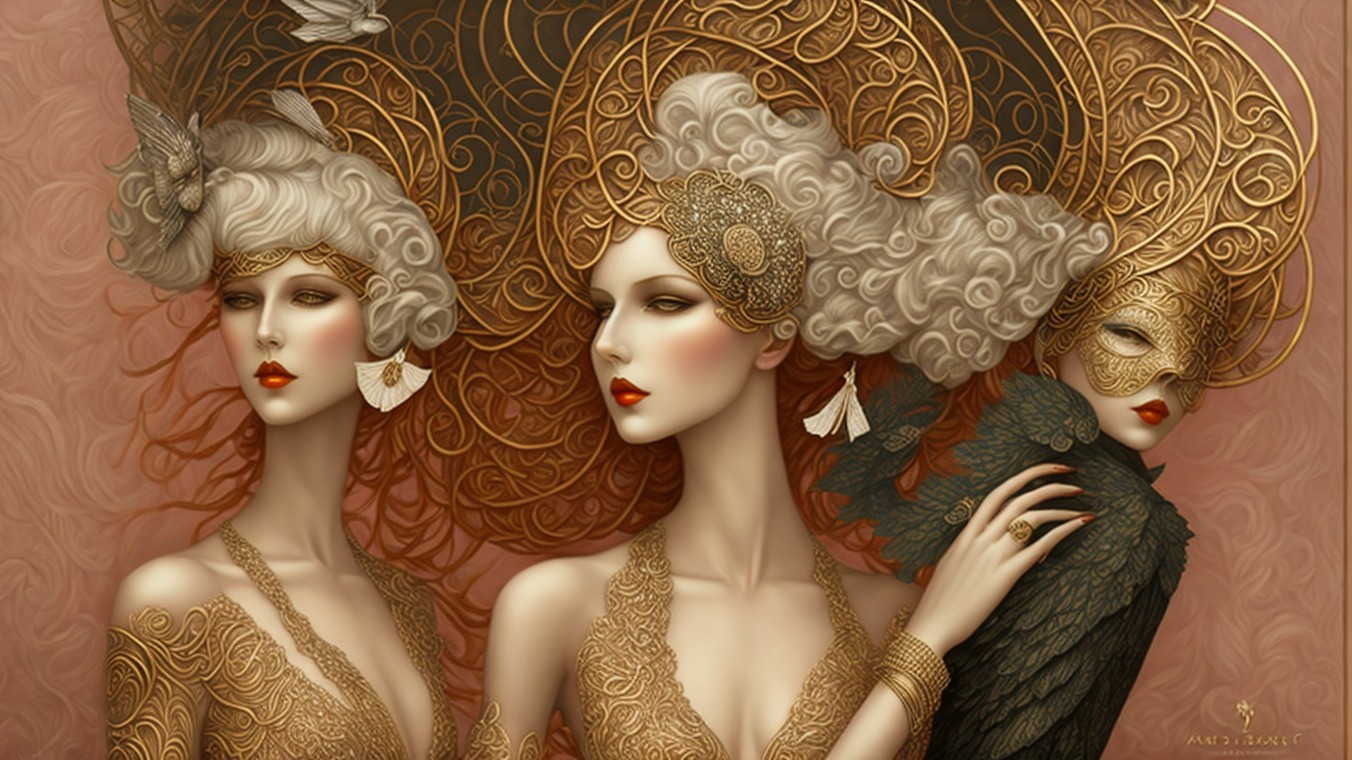 Two elegantly adorned women, featuring intricate headpiece designs and glamorous makeup, stand against a rich brown backdrop. One gently holds a striking bird, adding to the artful composition.