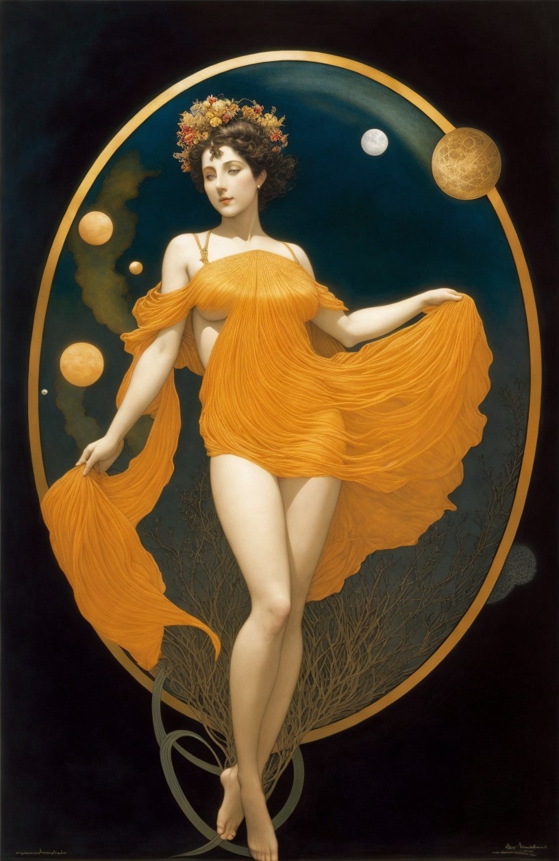 A graceful figure in a flowing yellow garment, lightly draped, stands against a starry background, holding glowing orbs, evoking a sense of ethereal beauty and cosmic elegance.