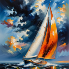 A vibrant sailing scene featuring a colorful yacht with billowing orange and white sails, navigating bold blue waves under a dramatic sky filled with dynamic clouds and warm hues.