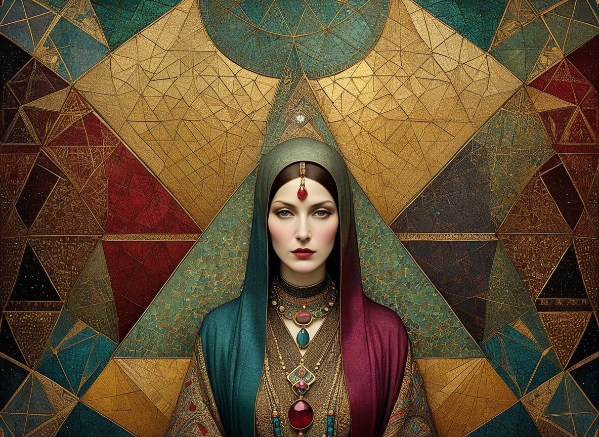 A woman with striking features wearing a colourful headscarf and ornate jewelry, set against a geometric background of rich colours and textures, evoking a sense of elegance and mystery.