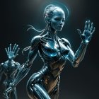 A futuristic female figure stands amidst a neon cityscape. She wears a sleek, shiny outfit and headphones, exuding a high-tech aesthetic with a glowing hand gesture that suggests power and allure.