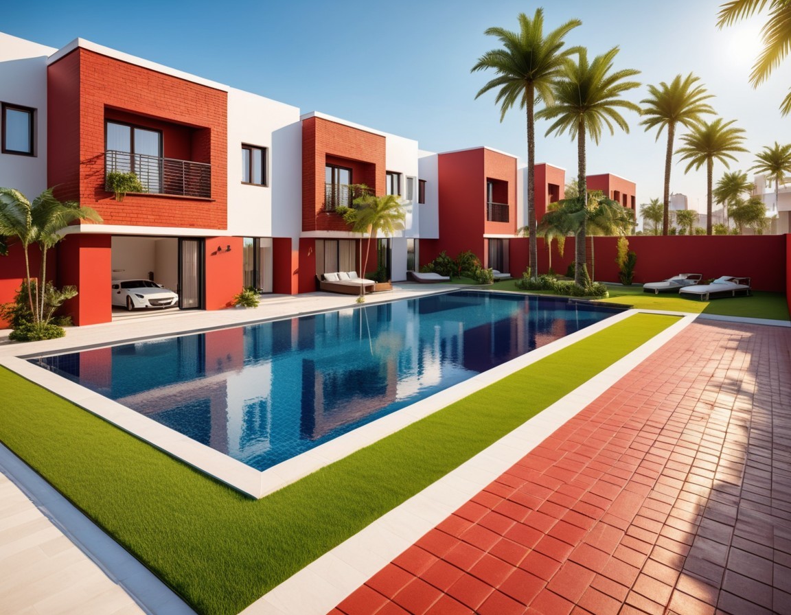 A modern villa complex features a large swimming pool surrounded by lush green lawns and palm trees. Cozy seating areas and a sleek car enhance the inviting atmosphere under clear blue skies.
