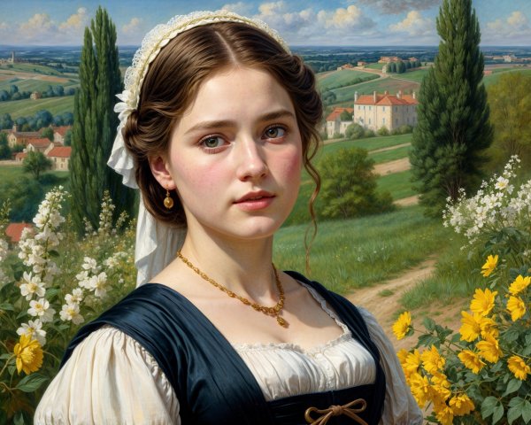 A portrait of a woman with elegant jewelry and a golden dress in a classical style, evoking a regal, historical aesthetic.