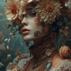 A model wears a stunning floral crown adorned with orange and peach blooms. Her makeup is soft and elegant, complemented by intricate gold jewelry and a detailed, textured dress.