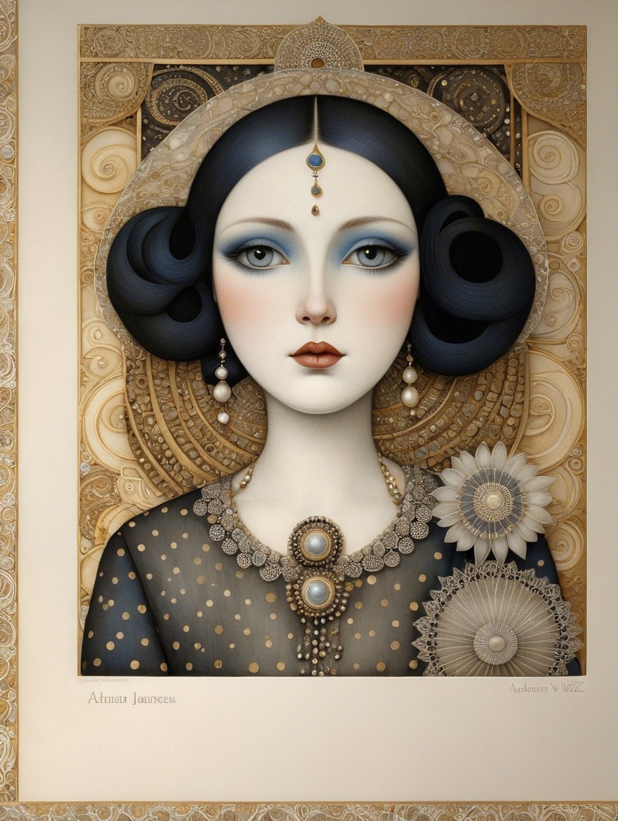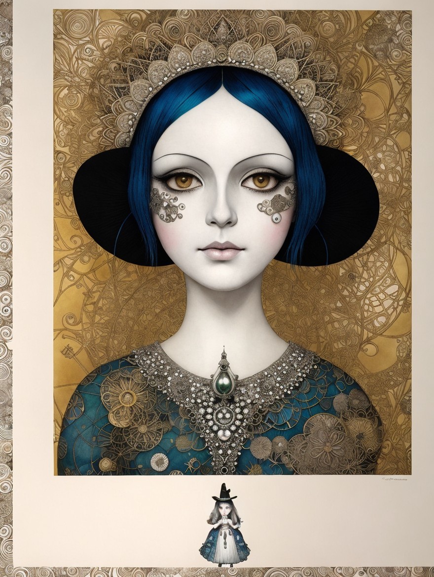 The image features a stylized portrait of a woman with striking blue hair and a serene expression, adorned with intricate patterns and geometric designs in warm tones.