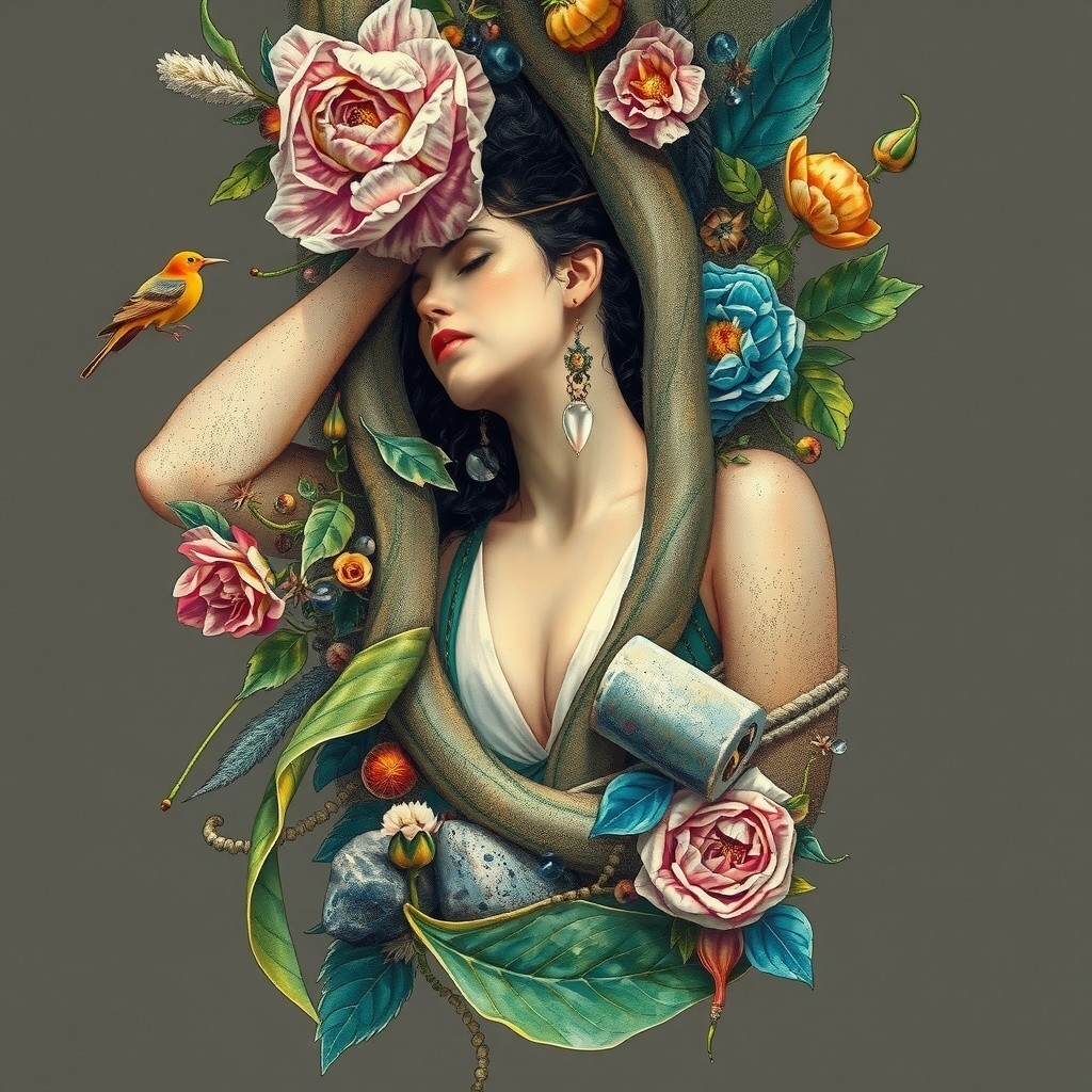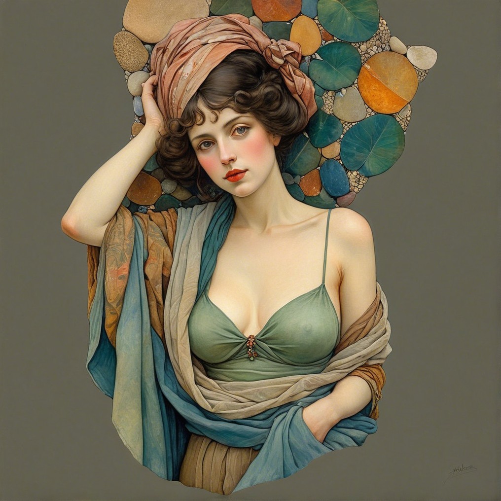A painting of a woman with a hat, draped in elegant clothing, holding a pensive pose with a subdued background.
